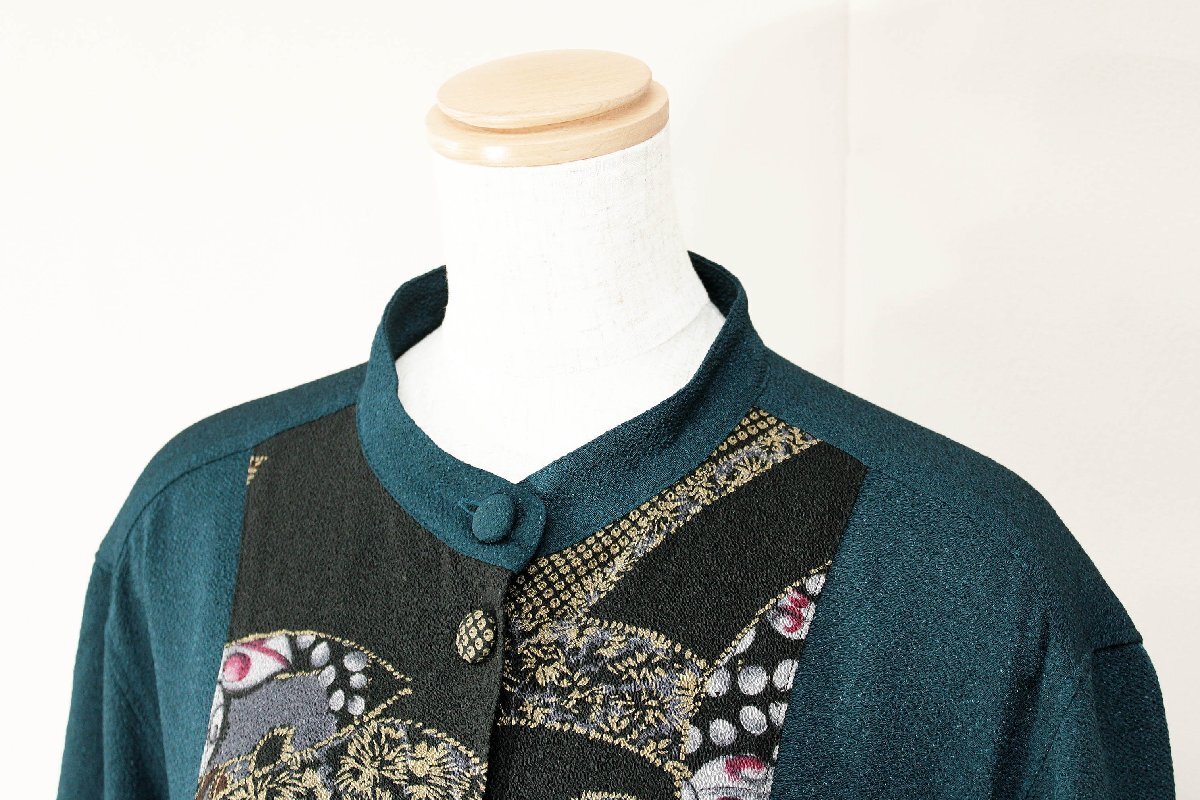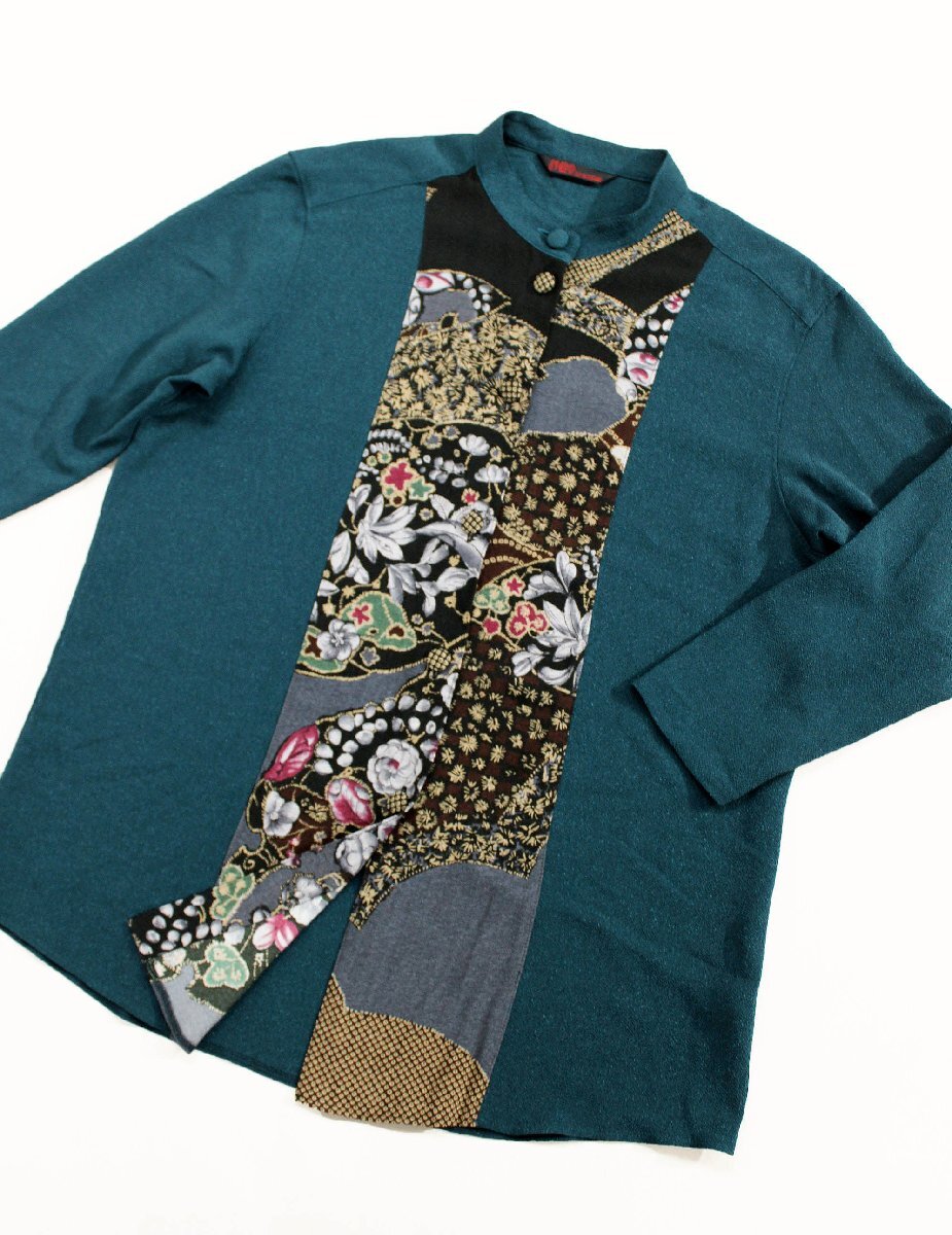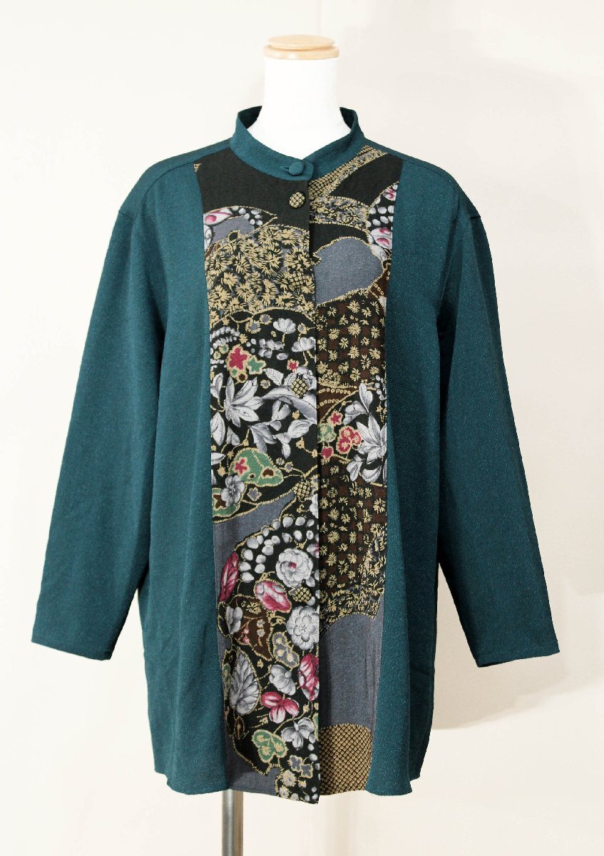 ☆美品☆詩仙堂/ちりめん織り和花柄プリント長袖シャツチュニック:青緑系yx964