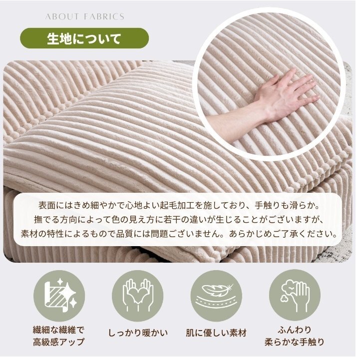 • このソファに使われているコージュロイ素材は、やわらかくてあたたかみのある風合いが魅力。ふんわりとした手ざわりで、座った瞬間からほっとくつろげるような心地よさを感じていただけます。通気性にも優れているため、蒸れにくく、一年を通して快適にお使いいただけます。見た目にも上品な光沢とぬくもりがあり、お部屋の雰囲気をやさしく包み込んでくれる、そんな素材です。