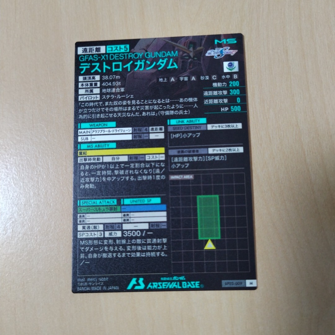 ガンダムアーセナルベース、Mレア、デストロイガンダムの出品となります。未使用品です。パック開封後、スリーブに入れて保管していますが初期キズなど気になさる方はご遠慮ください。配送料金は梱包代込みで全国一律、120円とさせていただきます。他の出品との同梱は対応いたします。ノークレム、ノーリターンにてお願いいたします。