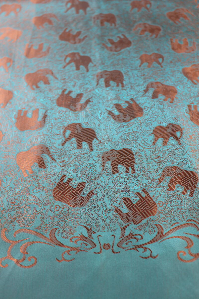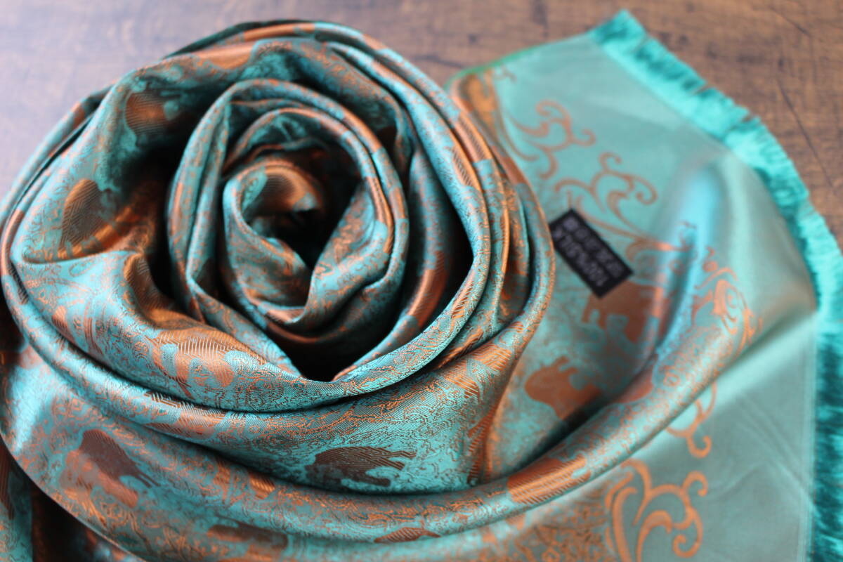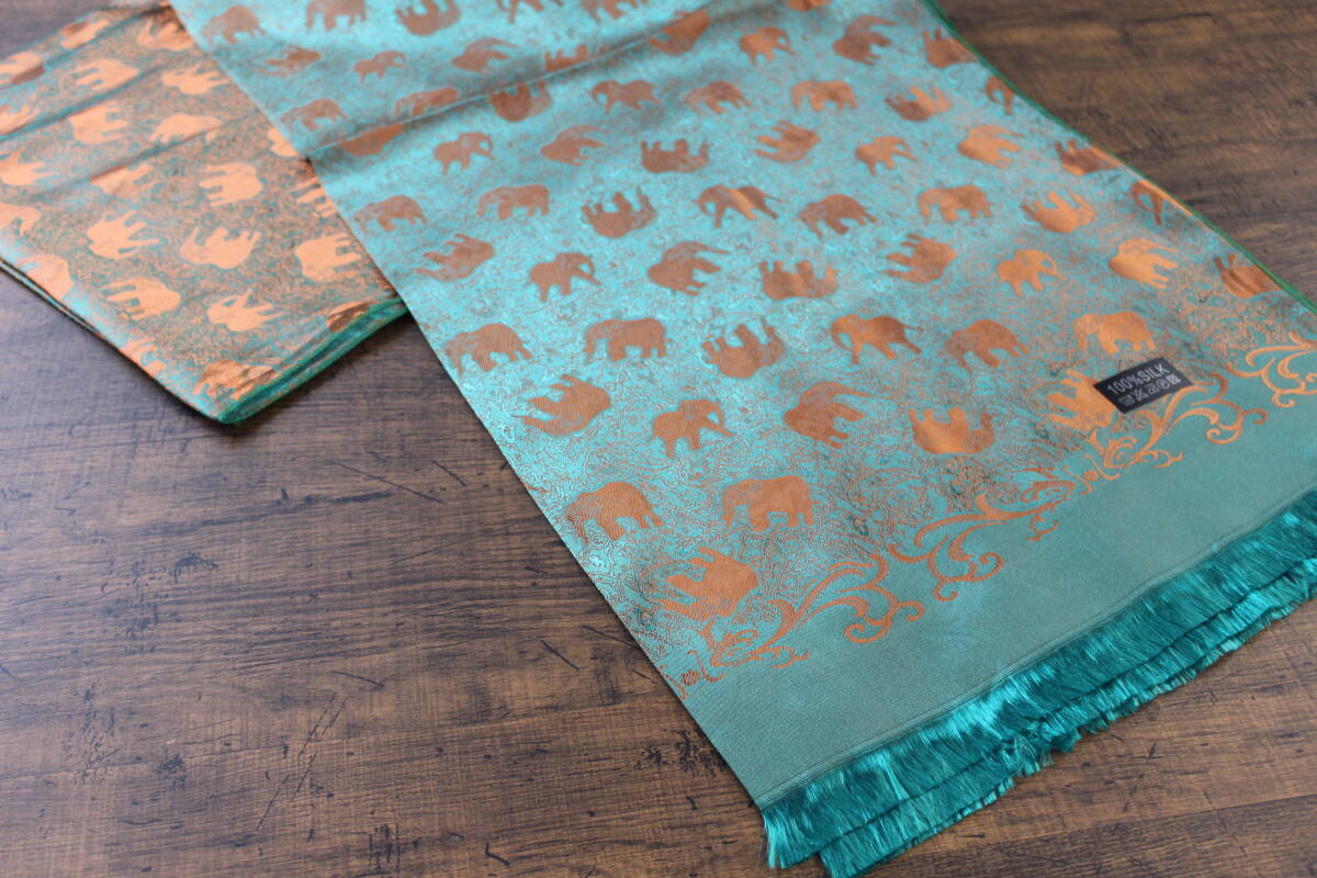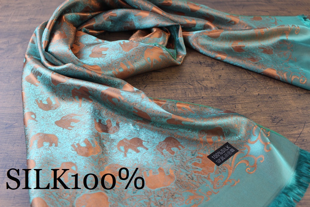 新品【シルク100% SILK】エレファント柄 象柄 シャイングリーン×シャインオレンジ 緑×橙 S.GREEN×ORANGE 大判 ストール/スカーフ