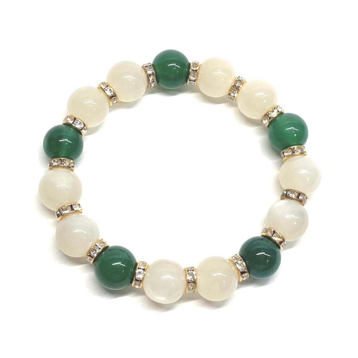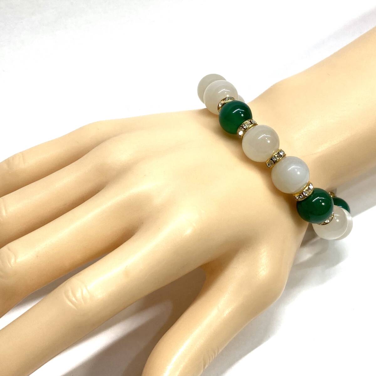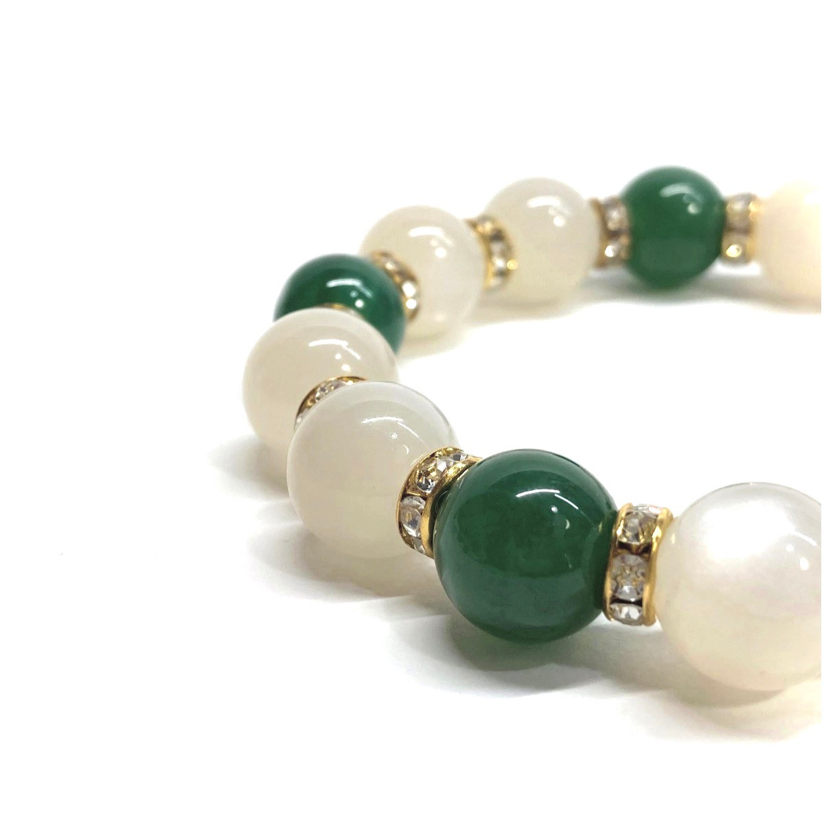 こちらは、ムーンストーンと緑瑪瑙を組み合わせたパワーストーンブレスレットです。間にはロンデルを挟み高級感あるデザインに仕上げております。程よくインパクトがある12mm玉を使用して内周約18cmです。(サイズ変更の場合は取引ナビにてご連絡をお願いします。) 数に限りがございますので気になる方はお早めにどうぞ。