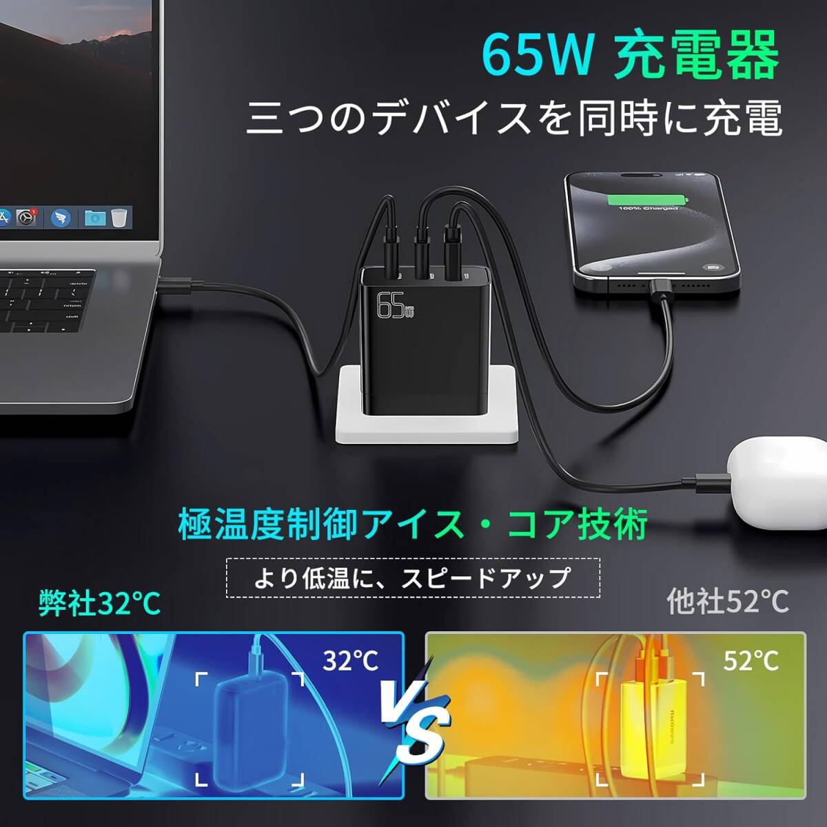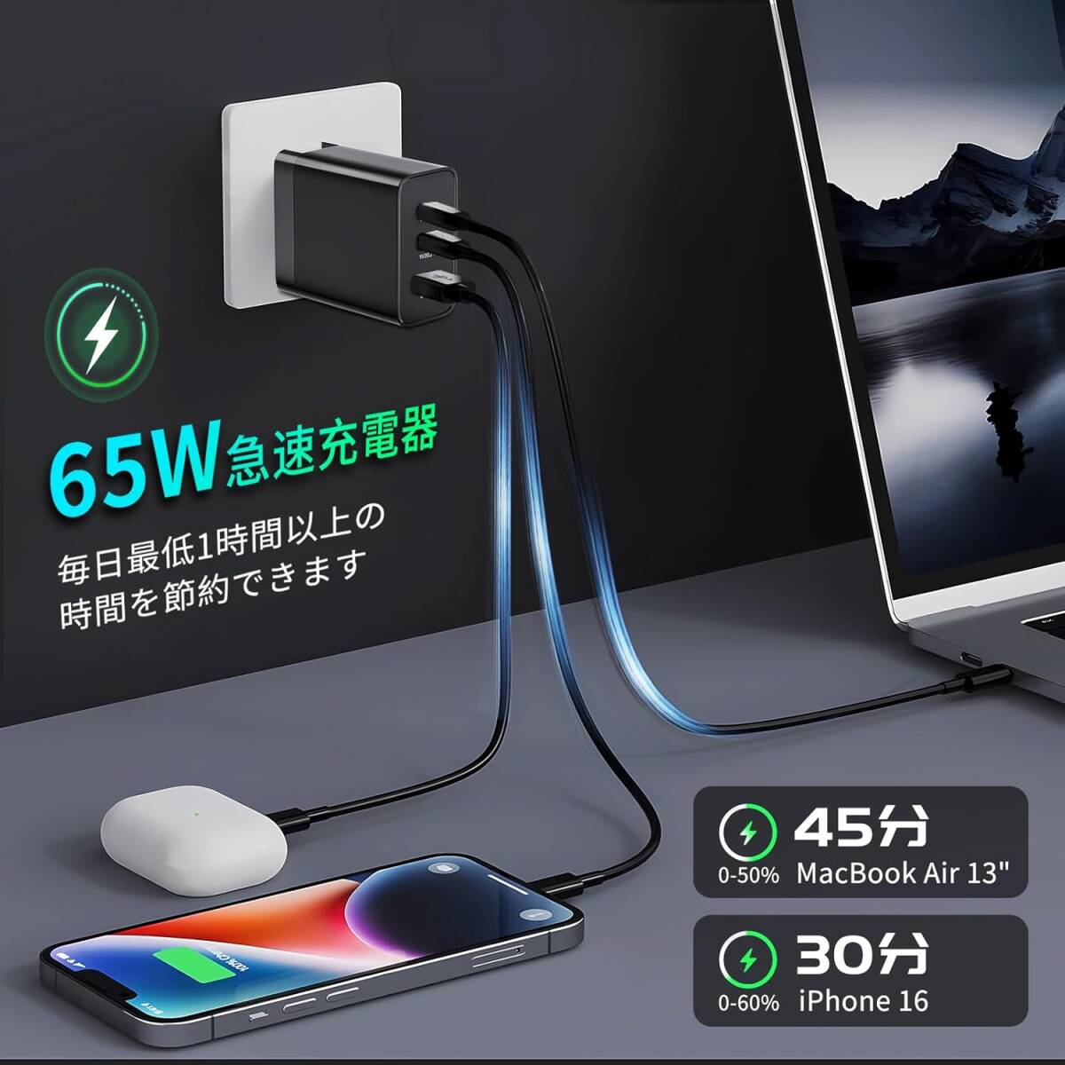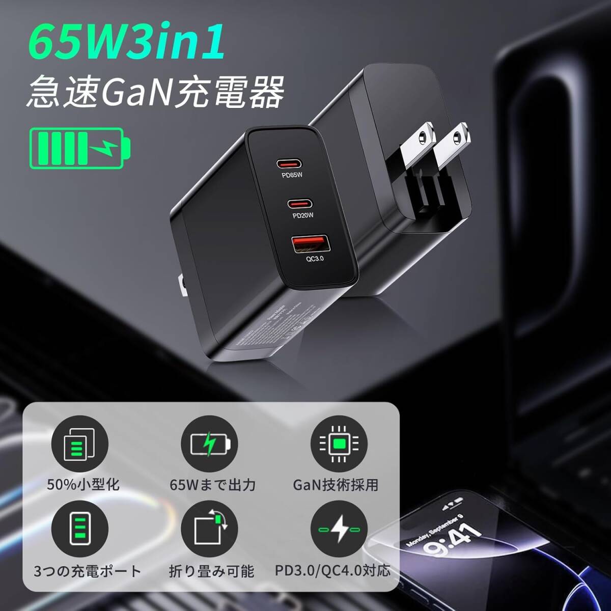 【最大出力65W・急速充電】65W Type-C充電器は、最先端の窒化ガリウムと3Dチップスタッキング技術を採用し6 x 5.5 x3cmの超小型化を実現しています。pd 充電器65Wのサイズをapple 充電器 65W小57%、50%軽量化、省エネ50%,わずかbluetoothイヤホンに大きさ、近くのコンセント穴にも干渉しません。 USB-C充電器の外観はシンプルで質素な外観ですが、性能は一流です。