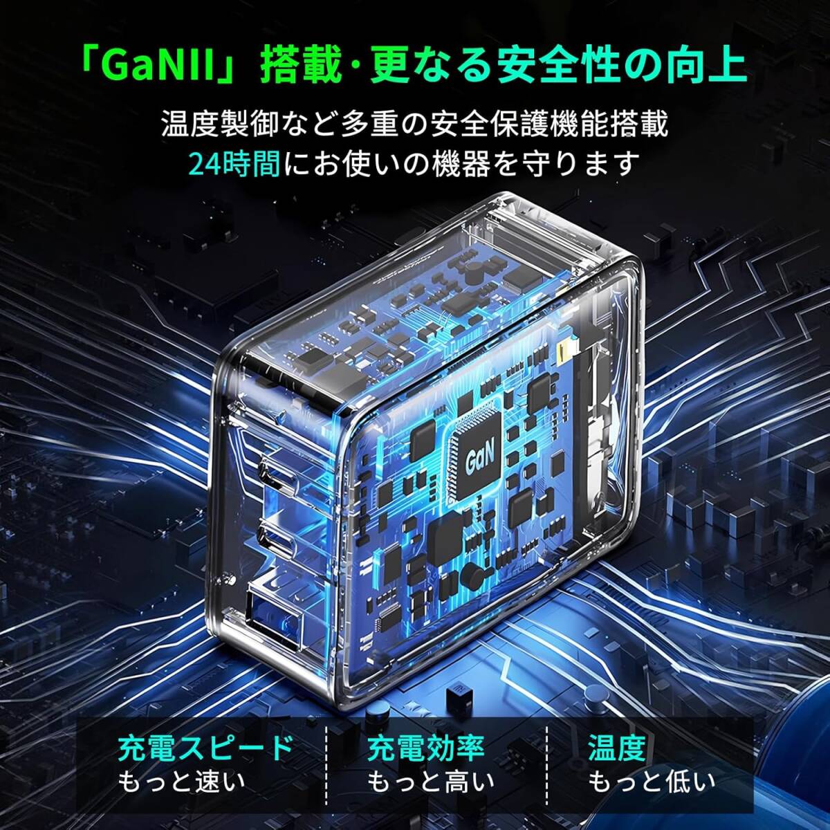 【GaN搭載多重安全保護機能】充電器は窒化ガリウム(GaN)技術を採用することで高出力かつコンパクトな設計を実現。従来製品と同じ多重保護システムに加え、により優れた安全性を実現。独自の温度管理と接続端末の保護システムでお使いの機器を24時間守ります。急速充電を実現しながらも、過電流、過電圧、過熱、短絡などのリスクをしっかり防止。耐火性PC素材を使用し、さらに安心です。PSEなどの電気安全に関する認証も取得しており、安全性が保障された製品を提供しています。信頼のブランドが、充電ライフをサポートします。