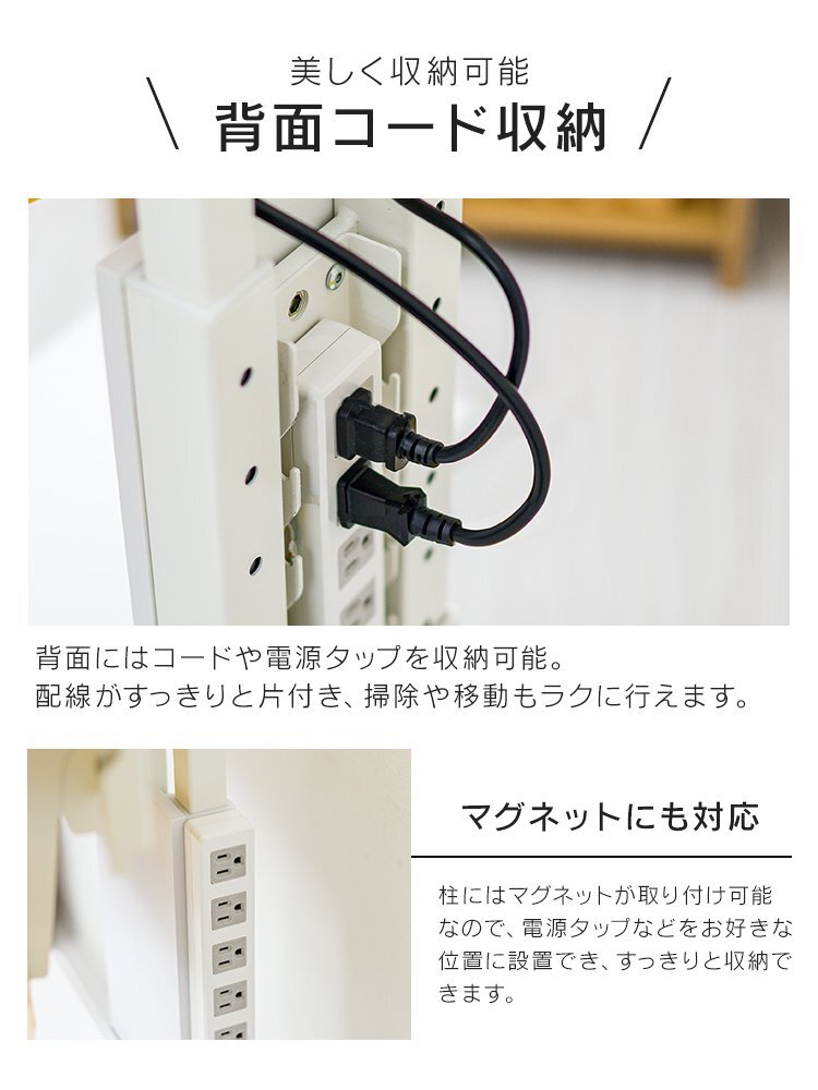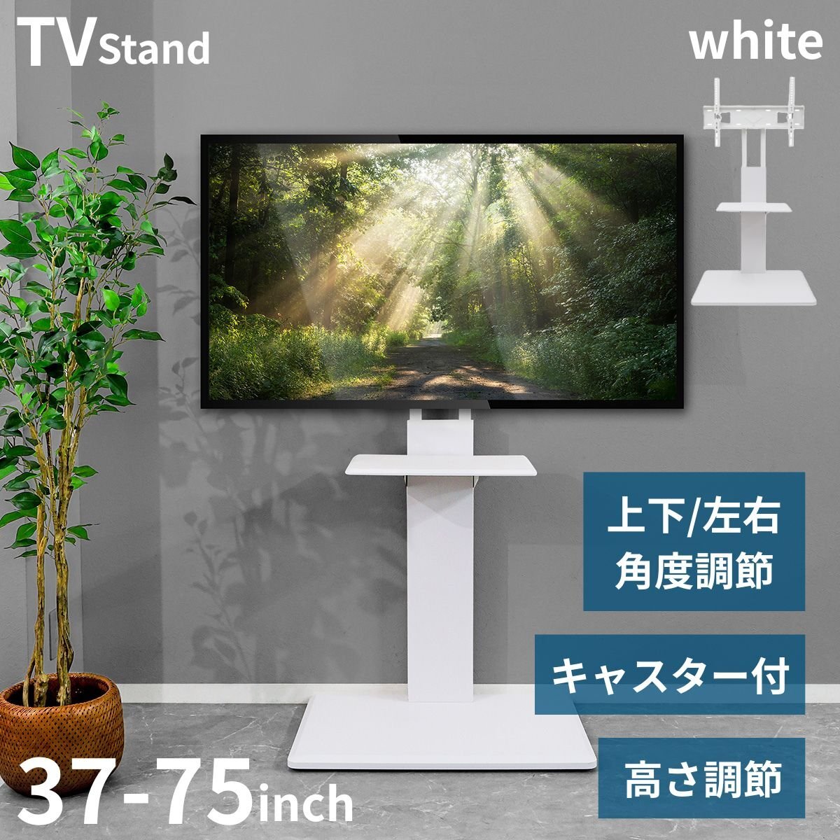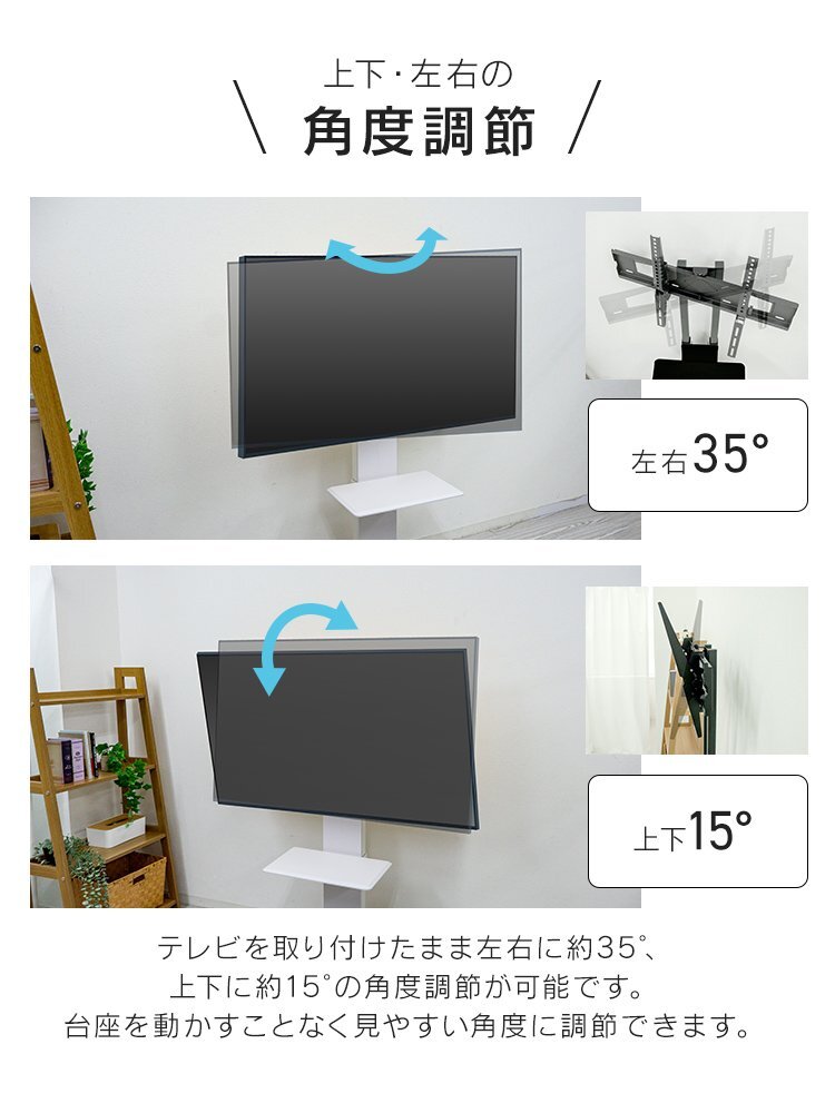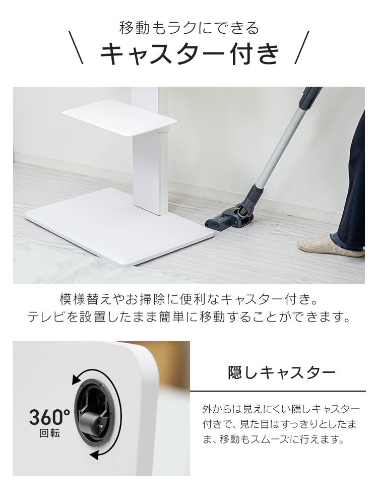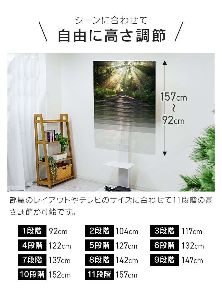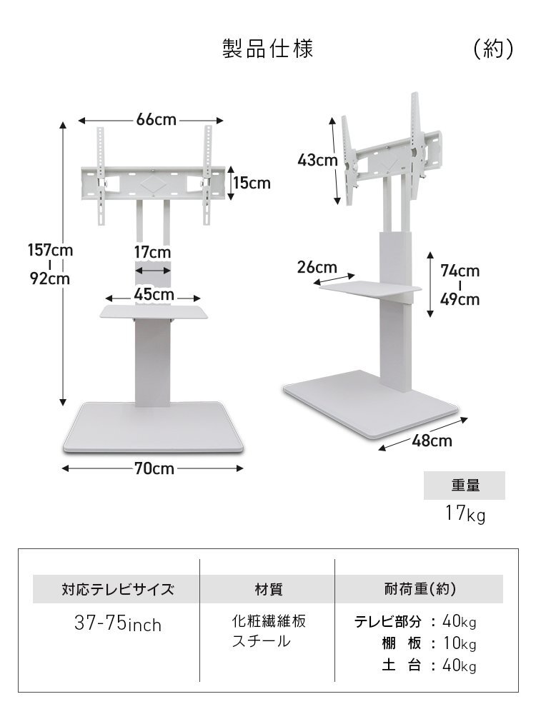 スタンド式で圧迫感のないスリムなデザインが美しいテレビスタンドです。 壁寄せのほか、お部屋の角にも設置可能です。 テレビは10段階の高さ調節・上下左右角度調節ができるので、シーンに合わせて最も快適な角度に調節可能です。 AV機器等を置ける棚板が付属しています。 使いやすい高さに5段階調節ができ、テレビ下のスペースを有効活用できます。 配線を背面に収納できるので、見た目もスッキリ。 デザインを邪魔しない隠しキャスター付きで移動もラクラク! もしもの時の転倒防止ワイヤー付きで安心です♪ 商品品番:TVSD1WH 【商品仕様】 サイズ:(約)70×48×157cm カラー:ホワイト 適用テレビサイズ:37~75インチ 耐荷重: 【テレビ取り付け部】(約)40kg 【棚板】(約)10kg 【土台】(約)40kg 角度調節:上下15度、左右35度 高さ調節:テレビ部10段階、棚板5段階 材質:化粧繊維板、スチール |
