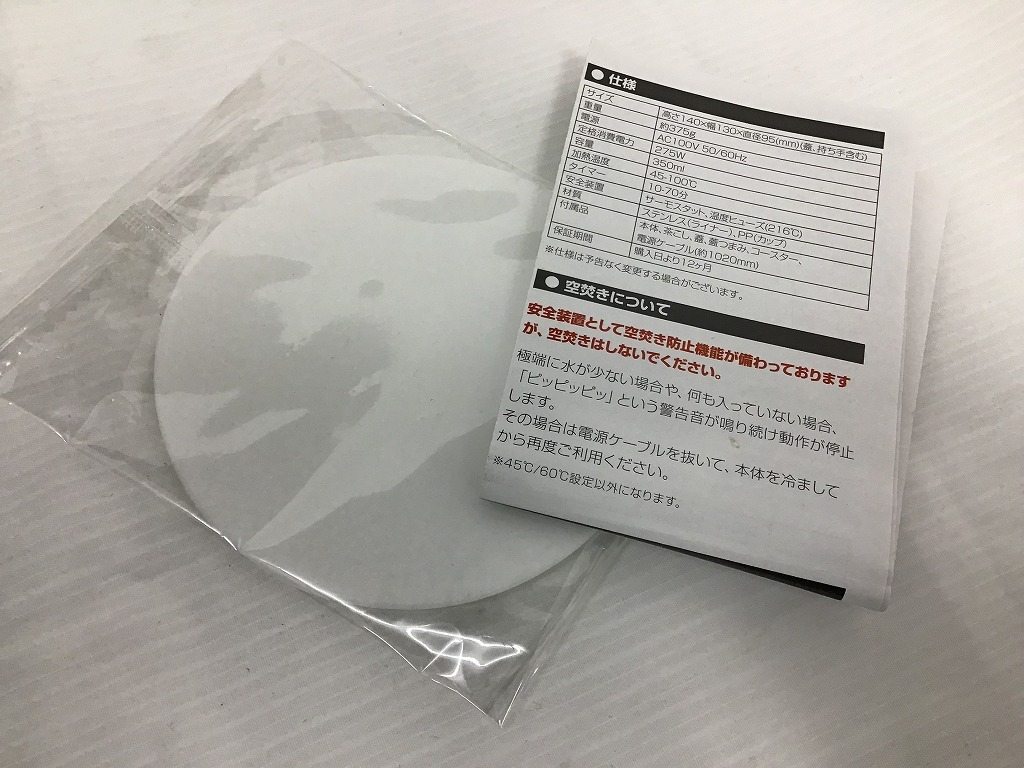 付属品取扱説明書,電源ケーブル,茶こし(本体装着)、コースター