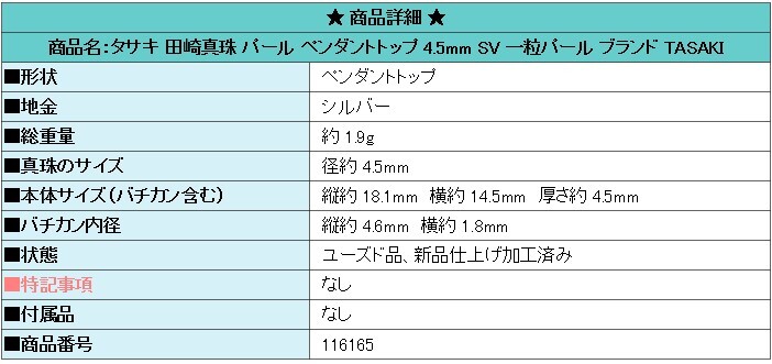 | 商品名:タサキ 田崎真珠 パール ペンダントトップ 4.5mm SV 一粒パール ブランド TASAKI | |