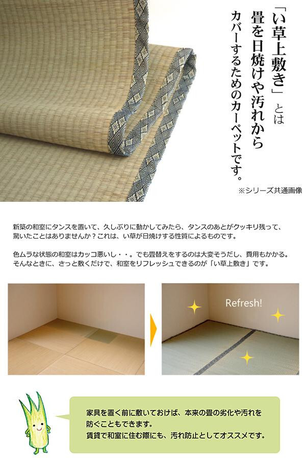| 上敷きを敷くだけで畳のお部屋をリフレッシュ出来ます。日焼けしてしまった畳のリフレッシュに、新品の畳を汚さないためのカバーにご使用下さい。 |
