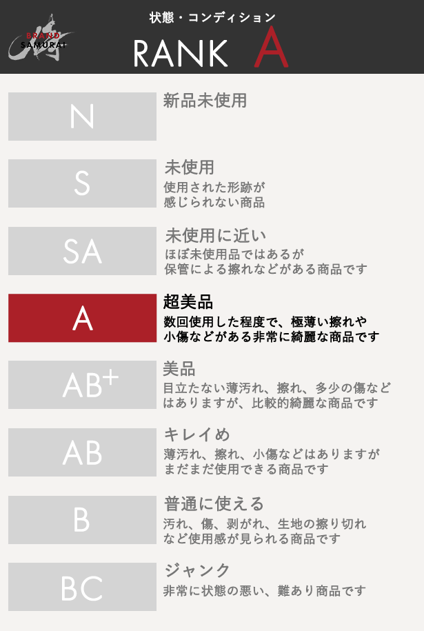 | 状態ランク | A 数回使用した程度で、極薄い擦れや小傷などがある非常に綺麗な商品です |