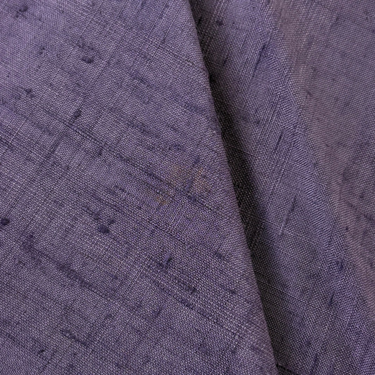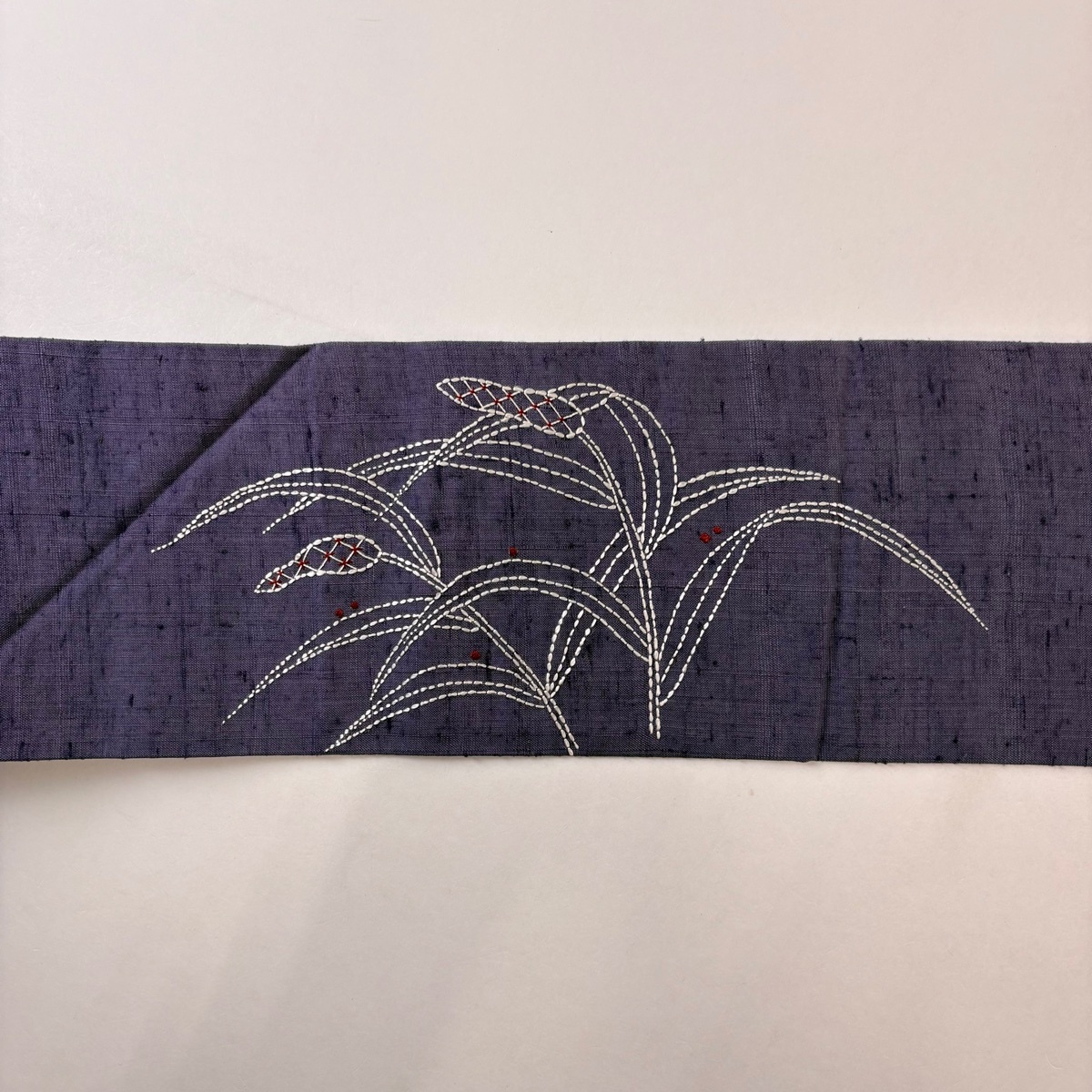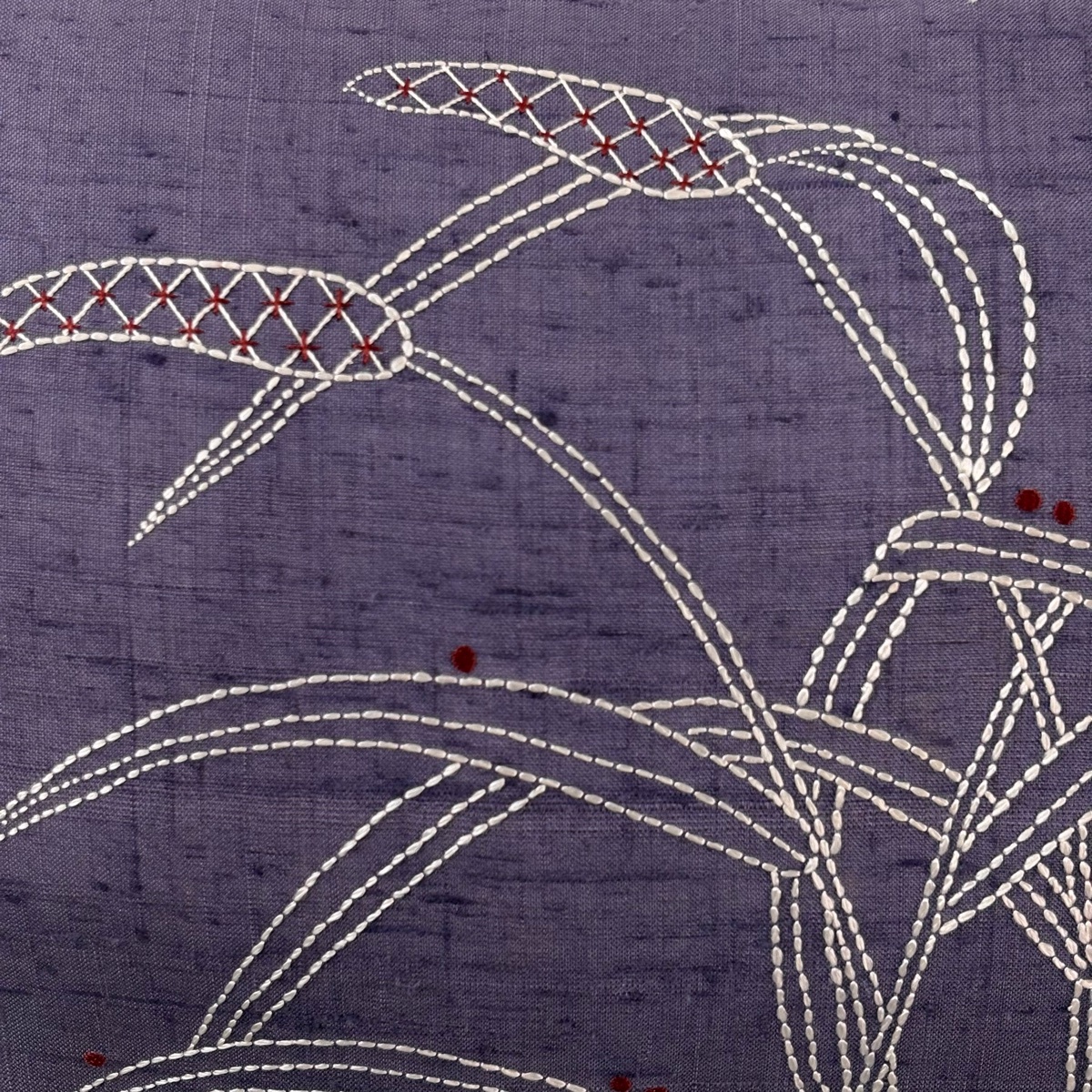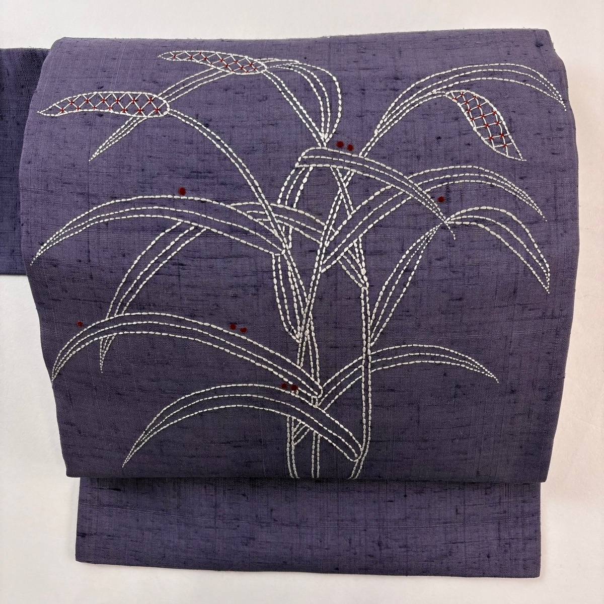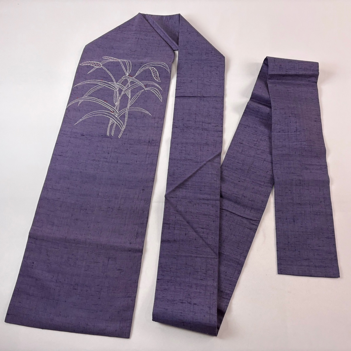 | 名古屋帯 秀品 紬地 葉 刺し子刺繍 灰紫 正絹 【中古】 |