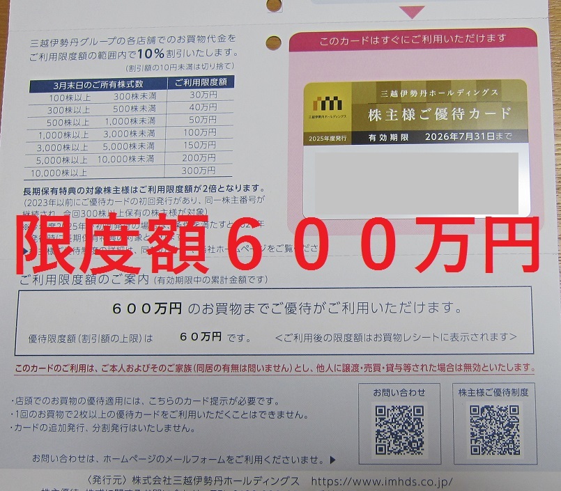 ゆうパック送料無料■三越伊勢丹 株主優待カード 利用限度額600万円 優待限度額60万円 継続10000株主 男性名義 レア■