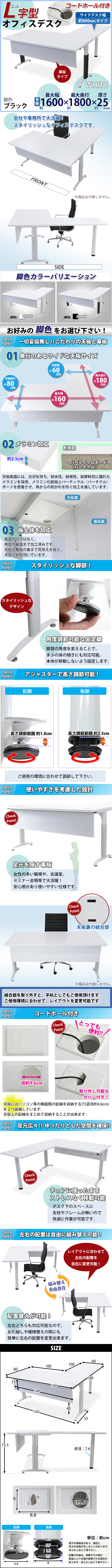 | 商品名 | 送料無料 オフィスデスク デスク L字型 幕板付 コードホール付 約W160×約D180×約H75.5 約W1600×約D1800×約H755 白 平机 ワークデスク 事務机 パソコンデスク PCデスク 事務デスク L字デスク L型 コーナーデスク 会社 事務所 ホワイト 配線穴 t016160whl032hl60 |