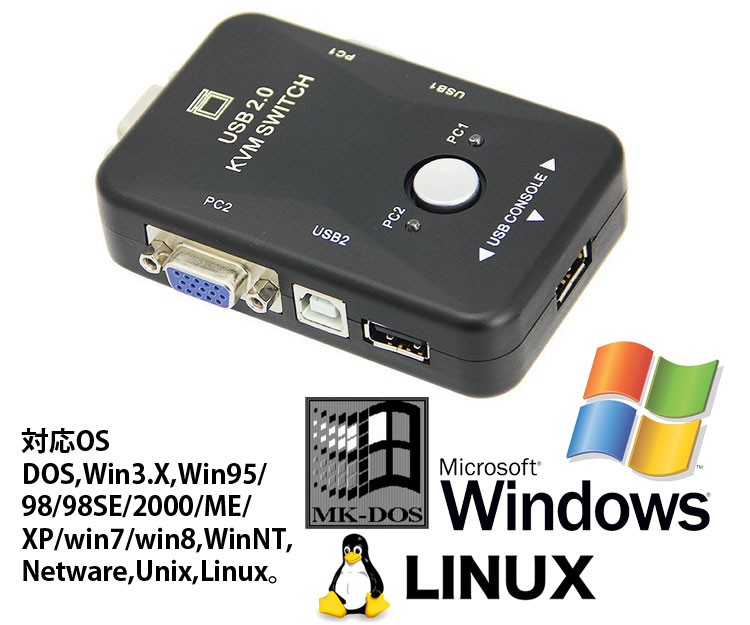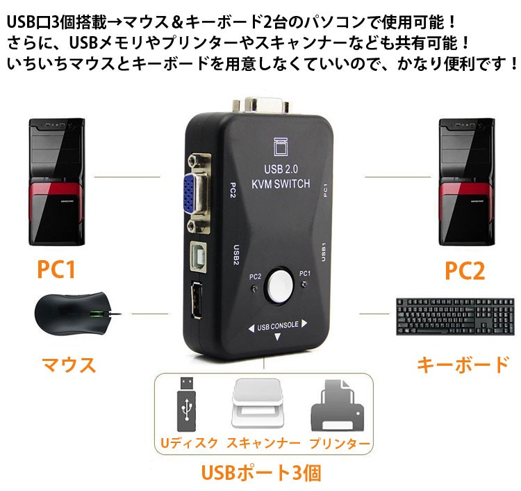 ノートパソコンでもデスクトップパソコンでも、2台のパソコンで1セットのマウス・キーボード・プリンタなど色々なUSB機器と、ディスプレイを共有できるUSBパソコン切替器です。