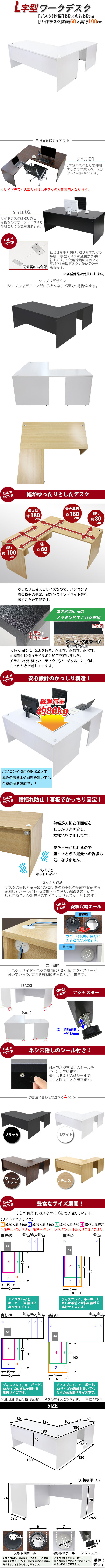 | 商品紹介 | ■作業スペースを広く確保出来る、L字型ワークデスクです。 ■サイドデスクの幅が約60cmのタイプです。 ■会議室や事務所等、オフィス家具として様々なシーンでお使いいただけます。 ■天板には、メラミン加工を施しています。 ■幕板が天板と側面板をがっちりと固定!横揺れを防止します。 ■ネジ穴隠しのシール付き。 ■デスクの天板と幕板に配線収納ホールが2カ所ずつ備わっています。 ■アジャスターで高さの調節が可能です。(高さ調節範囲〜約15mm) ※こちらの商品は、組立て式です。組立てにはプラスドライバーが必要です。お客様でご用意ください。 ※組立図が付属します。 ※サイドデスクの取り付けはデスクの左側専用となります。 ■材質:パーティクル(パーチクル)ボード(メラミン加工)(本体、サイドデスク)、プラスチック(アジャスター、配線収納ホール) ■重量:約68kg(デスク:約47kg、サイドデスク:約21kg) ■総耐荷重:約80kg ●新品商品ではありますが、輸入商品の為、多少の擦り傷などがある場合がございますので、ご納得の上ご購入下さいませ。 ●ご購入後、お客様ご都合によるご返品、ご返金等は一切お受け致しておりません。 ●本商品を使用した際に発生したトラブル、事故につきまして、当社は一切の責任を負いません。ご使用に関しましては、全て自己責任にてお願い致します。 ※カラーはホワイトとなります。 |