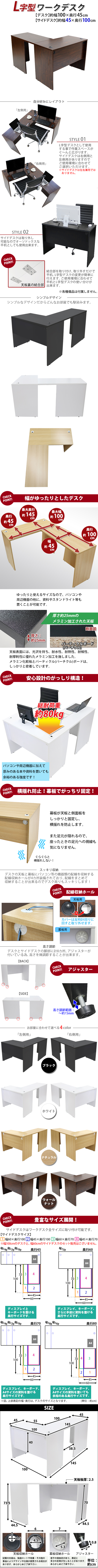 | 商品紹介 | ■作業スペースを広く確保出来る、L字型ワークデスクです。 ■サイドデスクの幅が約45cmのタイプです。 ■会議室や事務所等、オフィス家具として様々なシーンでお使いいただけます。 ■天板には、メラミン加工を施しています。 ■幕板が天板と側面板をがっちりと固定!横揺れを防止します。 ■ネジ穴隠しのシール付き。(サイドデスクのみ付属) ■デスクの天板と幕板に配線収納ホールが2カ所ずつ備わっています。 ■アジャスターで高さの調節が可能です。(高さ調節範囲〜約15mm) ※こちらの商品は、組立て式です。組立てにはプラスドライバーが必要です。お客様でご用意ください。 ※組立図が付属します。 ※サイドデスクの取り付けはデスクの右側専用となります。 ■材質:パーティクル(パーチクル)ボード(メラミン加工)(本体、サイドデスク)、プラスチック(アジャスター、配線収納ホール) ■重量:約35kg(デスク:約19kg、サイドデスク:約16kg) ■総耐荷重:約80kg ●新品商品ではありますが、輸入商品の為、多少の擦り傷などがある場合がございますので、ご納得の上ご購入下さいませ。 ●ご購入後、お客様ご都合によるご返品、ご返金等は一切お受け致しておりません。 ●本商品を使用した際に発生したトラブル、事故につきまして、当社は一切の責任を負いません。ご使用に関しましては、全て自己責任にてお願い致します。 ※カラーはウォールナットとなります。 |