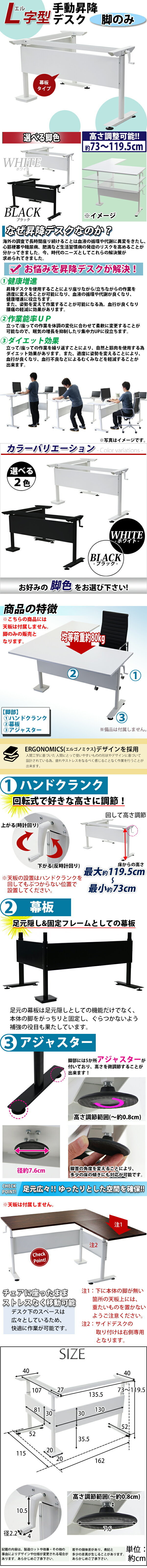 | 商品名 | 送料無料 昇降デスク L字型 手動 昇降 デスク 脚のみ 耐荷重約80kg(脚部) スタンディングデスク 上下昇降デスク 手動昇降 上下昇降 高さ 調節 コーナーデスク オフィスデスク 昇降式デスク 昇降テーブル 昇降式テーブル 手動デスク L字 L型 エルゴノミクス hj03leg |