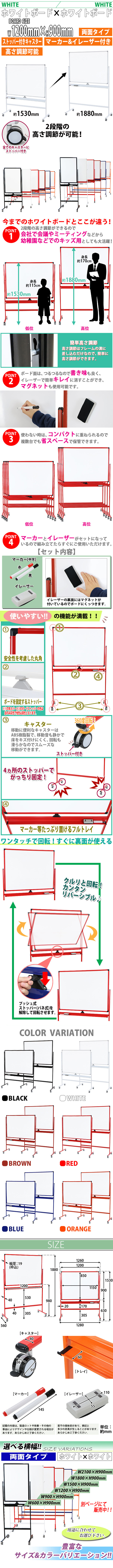 | 商品名 | 送料無料 ホワイトボード 脚付き 高さ調節 1200×900mm 両面 ハイグレードモデル ストッパー付キャスター 回転式 W1200×H900mm 120×90cm トレイ マーカー イレーザー付き スタンド 足付き アルミ枠 白板 無地 スチール リバーシブル フレームカラー ホワイト whbdaf12090wwst |