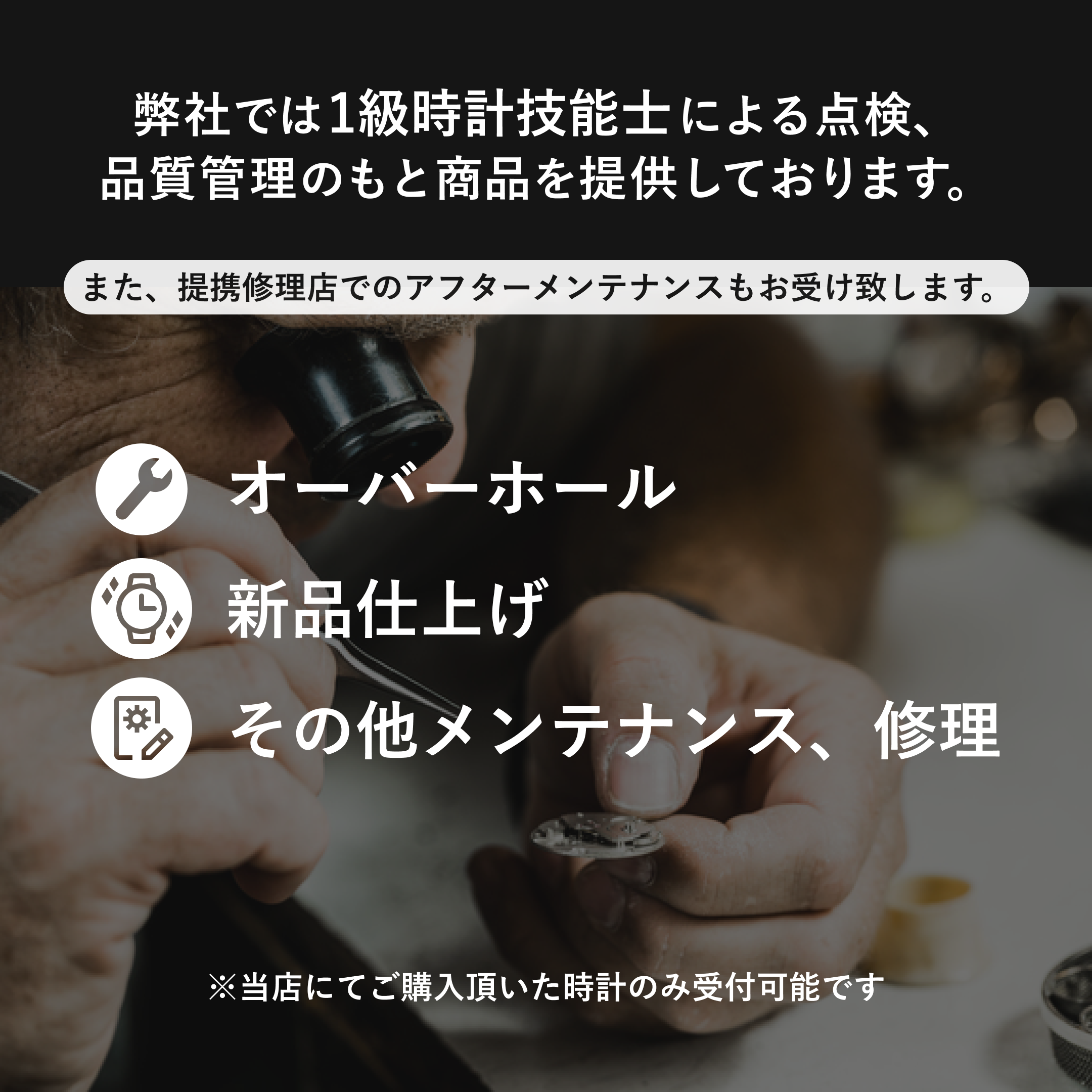 ※各種機能や動作、専用計器を使用した精度等の点検を厳しく行い、全ての工程をクリアした個体のみを販売しておりますので、その点はご安心下さい※ ■外観におきましても、中古品におけるキズや劣化等を全てお伝えするのは困難なため、軽微なものや弊社が中古品、ヴィンテージ、アンティーク品として妥当と判断した場合は説明を省かせて頂く場合がございます。もちろん著しい機能の低下や、外観の劣化等は記載させて頂きますのでご安心下さい。商品の状態について気になる方は、ご購入前にお問い合わせ下さい。また強い磁気を発する電子機器(スマホ、PC、リモコン等)と密着させ時計を放置すると、時計が磁気帯びを起こし故障の原因となる場合がありますので、磁気帯びにはご注意ください。機能面や外観等、USED品にご理解頂ける方のご購入をお待ちしております。 ■中古品の特質上、外観や操作性など主観によるコンディション評価を理由とした返品、日差の大小、機能面、その他コンディションを理由とした返品は承っておりませんので、あらかじめご了承のほどお願いいたします。 ■動作保証付きの商品に関しては、時計の通常使用における自然故障(ムーブメントのみ)に対して無償修理を行います。詳しくは商品に付属の動作保証書をご確認下さい。 ■メーカーBOX、その他メーカー付属品が付属する場合、経年による劣化や痛みが見られる場合がございます。それら付属品は基本的に時計の機能及び実用性等に影響を与えることがない為、軽微なものや弊社が商品の製造年代や中古品として妥当と判断した場合は、細かい説明記載や写真掲載を省かせて頂く場合がございますので予めご了承下さい。特に気にされる方はご購入前にお問い合わせ下さいませ。また記載の商品コンディションは、商品本体のみのものとなり、付属品の状態は含まれておりません。