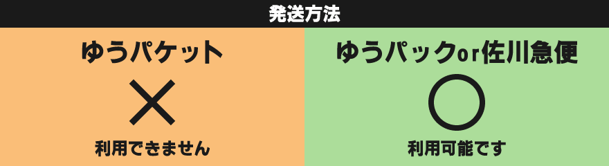 発送方法は「定形外」「ゆうパケット」「ゆうパックまたは佐川急便」の3種類あります。利用できる発送方法は上記、発送方法の画像を参照ください。同梱発送を利用の方は「定形外」を利用できません。ゆうパケットは郵便局からの保証がありませんので注意してください。