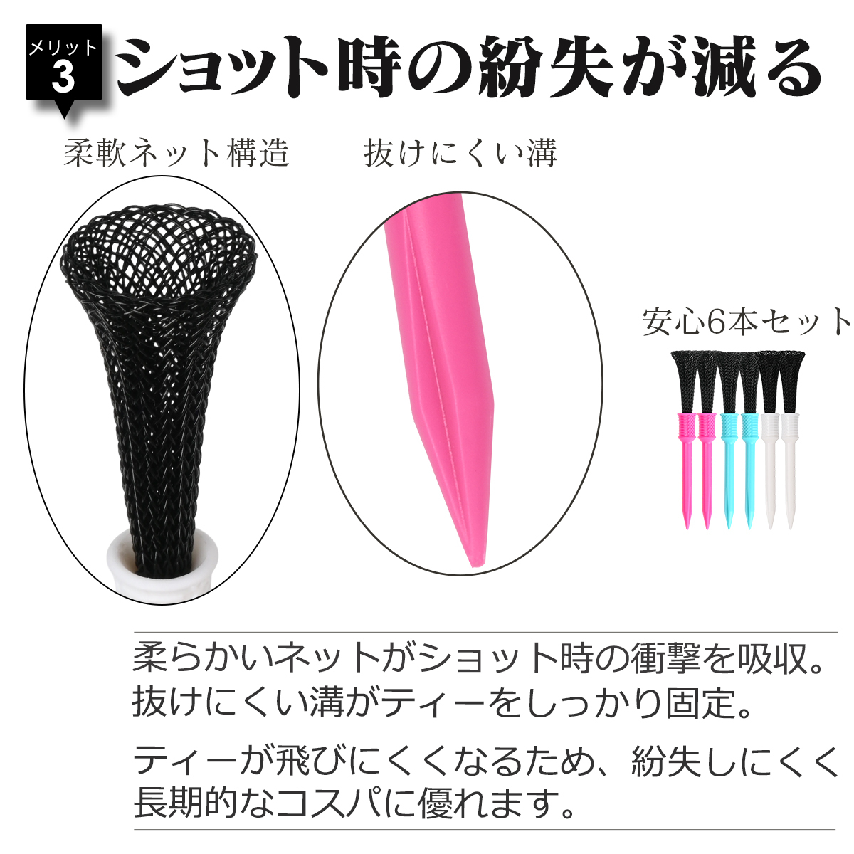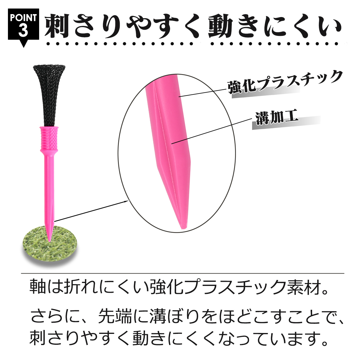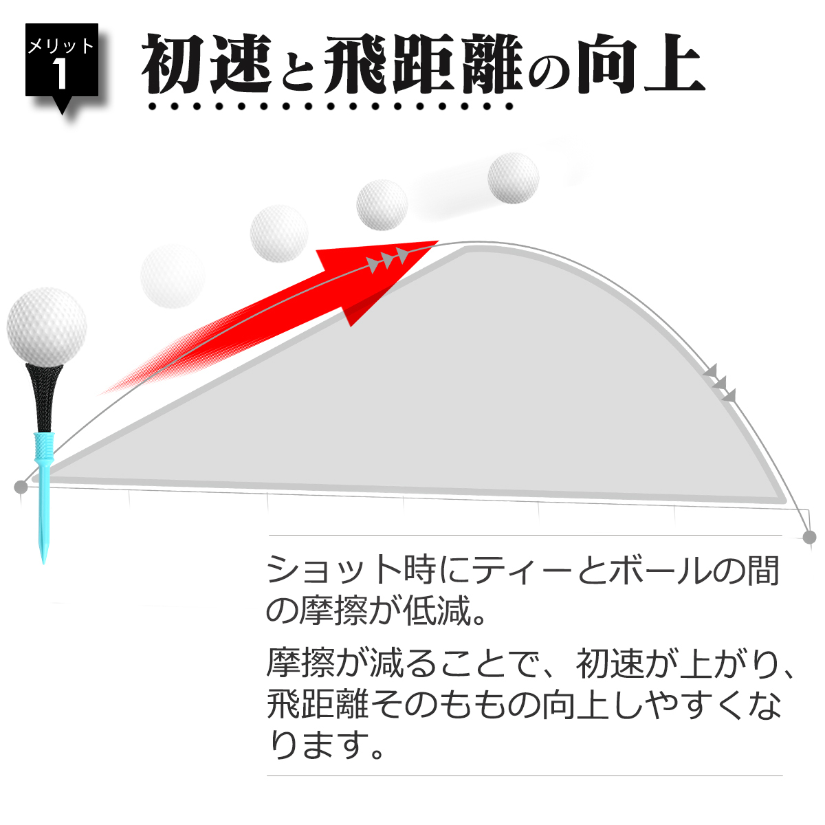 ・衝撃吸収性の柔らかい素材で、ショット時のティーとボールの間の摩擦を低減し、打球速度と飛距離を向上させます。