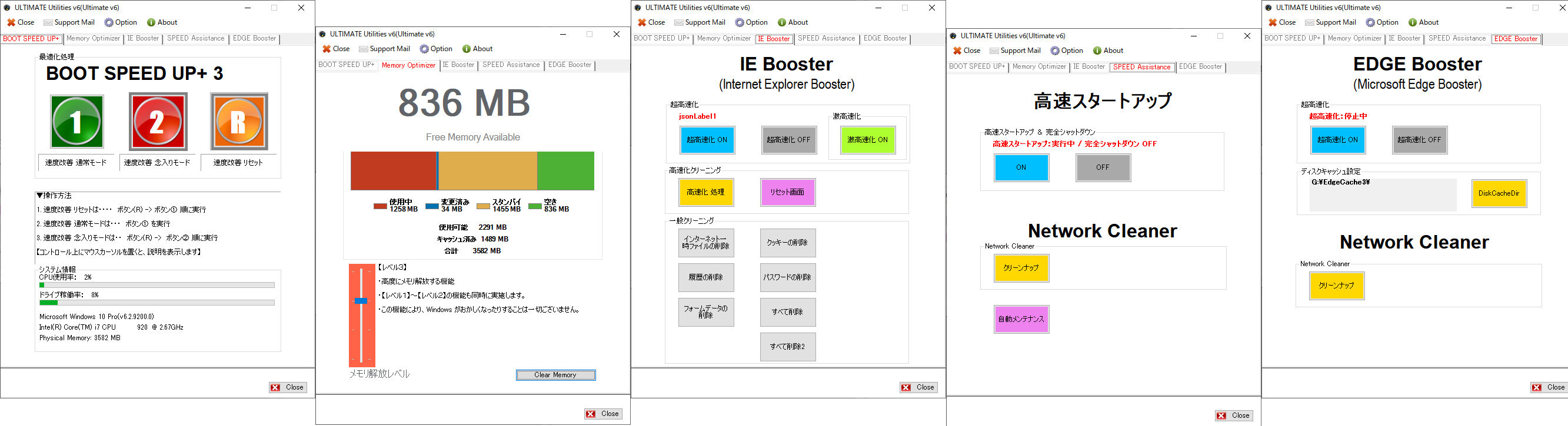 ■ BOOT SPEED UP+ 3 ■ 操作はかんたん、ボタンを押すだけです。 機能ボタンを押すだけで、自動的に処理します。 1.速度改善 通常モード 2.速度改善 念入りモード 3.速度改善 リセットモード 機能の説明 1.速度改善 通常モード 速度改善情報の組み直しを実行 2.速度改善 念入りモード 念入り・完璧に速度改善する場合にご使用下さい。 3.速度改善 リセットモード 速度改善情報の情報収集を行います ----------------------------------------------------------------------------------------------- ■ Memory Optimizer+ ■ 操作はかんたん、ボタンを押すだけです。 メモリ解放レベルは4段階、お好みを選びボタンを押すだけで自動的に処理します。 |