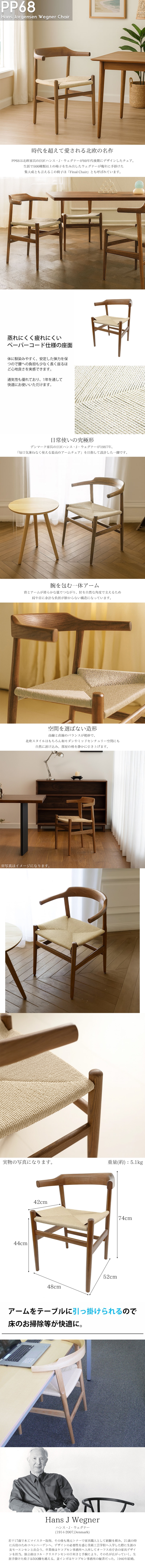 ![]() "Yチェアなどで有名なデンマークの巨匠ハンス・J・ウェグナーのアームチェア ウェグナーが80年代後期にデザインしたダイニングチェアです。 40年以上に渡り機能性と美しさを追求し続け、生涯で500種類以上ものチェアを手掛けたウェグナーの、 まさに集大成とも言えるダイニングチェアです。 背もたれとアームは、 最上級の座り心地が得られるよう人間工学的にデザインされています。 その快適さは、何時間でも座り続けられてしまうほど。 心地よい夕食のひと時にぴったりな、快適で座り心地のよいダイニングチェアを作りだしました。 このチェアの短いアームがテーブルの下にもぐりこむようにデザインされています。 浅く座れて、深く座れる=食事・作業がしやすく、リラックスしやすい椅子。 そんなPP68チェアはとてもデンマークらしい、素朴ながら繊細で耐久性に富むペーパーコードの座が特徴的です。 編まれた座面は座り心地も柔らかく、そのシンプルながらも高い機能性を持ったデザインからは、 ウェグナーの椅子へのこだわりを感じさせます。 お掃除時に背面が少し低い分ダイニングテーブルに背面をかけたときに床と椅子の有効空間が大幅に取れ、 掃除機やクリーンワイパー等の道具がかけやすく、 ダイニングテーブル下のお掃除が効率的かつ快適にしやすくなっております。 ※座面のペーパーコードは自然素材ですので、ホコリや汚れがついたまま放置しますと劣化の原因になりますので、 軽いブラッシング等でお手入れして頂くと長く風合いが保てます。 ※無垢素材ですので、1点1点木目の出方や色合いに個性があり、同じものではありませんので、予めご了承ください。 材質 座面:ペーパーコード フレーム-無垢材(アッシュ) オイルフィニッシュ カラー:ナチュラルウッド サイズ(約):幅48cm*奥行き52cm*高さ74cm*座面高44cm 重量(約):5.1kg ※こちらの商品は自然素材のため色ムラ、細かなキズがある場合がございます。 塗装はげのようなものがある場合がございますが、 商品の特性としてご理解いただきますよう宜しくお願い致します。 ※この商品はリプロダクト品になります。PP mobler社の商品ではありません。 |