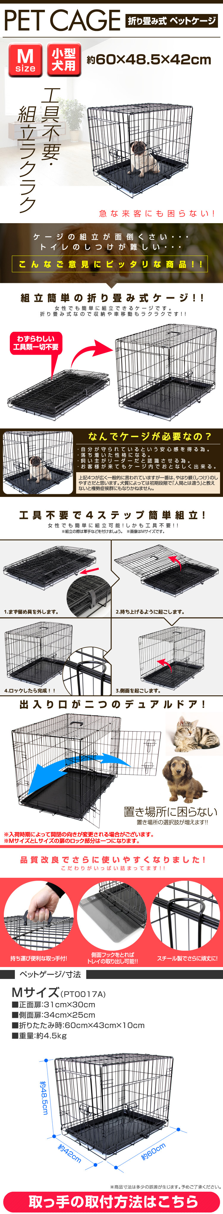お留守番や、しつけに最適! 移動に便利な折りたたみ式ペットケージ。 本体はネジ等を一切使用せず、パタパタっと開くだけの簡単組み立て式です。 折りたたむことができるので、使わない時の収納や移動する時もラクラク! 日頃からケージを自宅で使用し、ワンちゃんも使い慣れることで、 お出かけ先でも安心して休むことができ、ストレスの軽減にもつながります。 留守中やワンちゃんから目を離す時、いたずらによる怪我や事故の防止にも役立ちますし、 緊急時の避難用にも重宝します。 【商品仕様】 カラー:ブラック サイズ(約):60cm×42cm×48.4cm (折りたたみ時(約):60cm×43cm×10cm) 材質:スチール、ABS樹脂 重量(約):4.5kg 参考サイズ:ミニチュアダックスフント・コーギー 等 【注意事項】 ・こちらの商品は小型犬用のケージとなります。 ・ご注文時サイズは必ずご確認ください。 ・参考サイズはあくまで目安です。 ・本製品は屋内専用です。屋外で使用すると錆や変色の原因となります。 ・サイズ間違い、イメージとの違いによる返品、交換は一切行っておりません。 ・海外製品で、簡易梱包での輸入のため風防に擦れや多少の小キズなどがある場合がございますが、商品自体には問題ありませんのでご了承下さい。 ・仕様・デザインは改良のため予告なく変更することがあります。 |