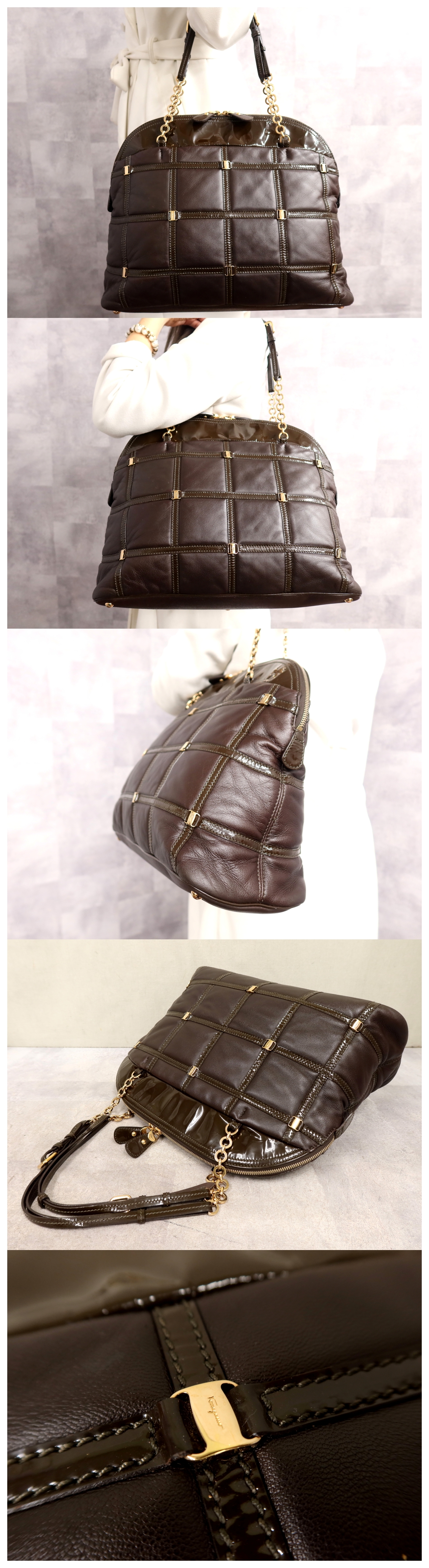 ●超美品●フェラガモ●ヴァラ●エナメル パテント ラムスキン レザー 本革●チェーン トート バッグ●ダークブラウン●A4 収納●Js64846