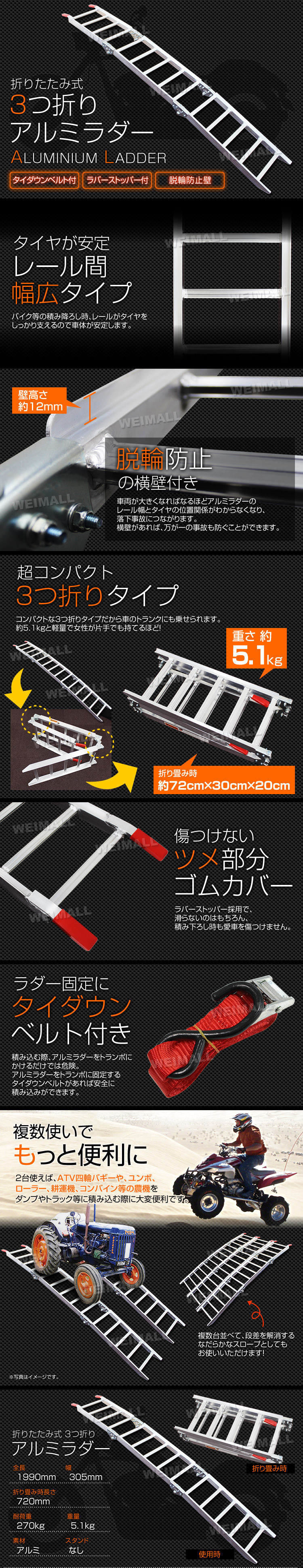 ATV四輪バギー・ダンプやトラック等にユンボやローラー・耕運機・バイクなどを積込みする為の折りたたみ式アルミラダーです。 場所の取らない3つ折りたたみタイプ! わずか約5kgの軽量ながら耐重量は270kgと高性能。 レールの細かい溝と溝を広く取ったレールが滑るにくくなっております。 サイドには脱輪防止の溝がついており、ラダーから車体を落とす事故を予防できます! 横倒れ防止のタイダウンベルトも付いているので安心!! ■商品仕様 折りたたみ式 全長(約):1990mm 幅(約):305mm 耐荷重(約):270kg 重量(約):5.1kg 素材:アルミ ■商品内容 本体 ×1 タイダウンベルト ×1 ■注意事項 ・耐荷重以上の重さを掛けないでください。 ・重量物の荷を積み降ろしする場合は、お二人以上での作業をお勧めします。 ※写真と実物は多少異なる場合がございます。あらかじめご了承下さい。 ◆保証期間:7日間 ※商品到着後7日以内の初期不良・破損のみご対応させていただきます。 |