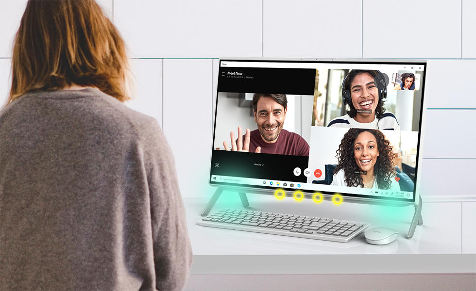 4つのマイクが広範囲に音声を拾い、Diracのボイスモードを使えば相手の声もクリアに聞こえます。一人でも、大画面を囲んだ複数人でもオンラインコミュニケーションを快適に楽しめます。