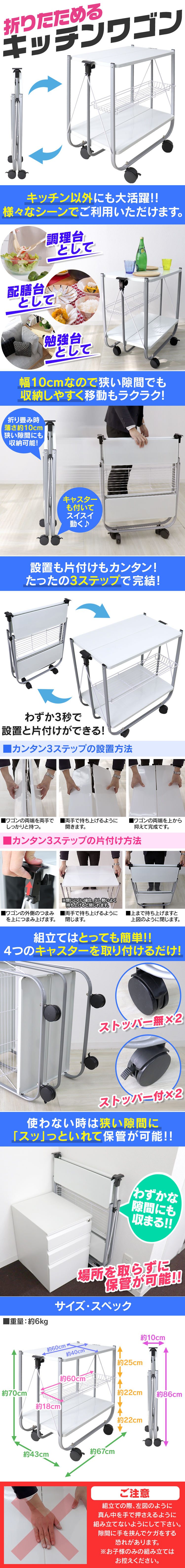 | 折りたためるキャスター付きのキッチンワゴン。 組み立てはとっても簡単!4つのキャスターを取り付けるだけ! キッチン以外にも大活躍! 様々なシーンでご利用いただけます。 幅10cmなので、狭い隙間でも収納しやすく移動も楽々。 使わないときは狭い隙間にスッと入れて保管が可能。場所を取りません。 ●商品仕様 サイズ(約):高さ70cm×幅67cm×奥行43cm(設置時外寸) 高さ86cm×幅67cm×奥行10cm(折りたたみ時外寸) ●注意事項 組み立て(折りたたみ→設置)の際は、手を挟まないようにご注意ください。 |