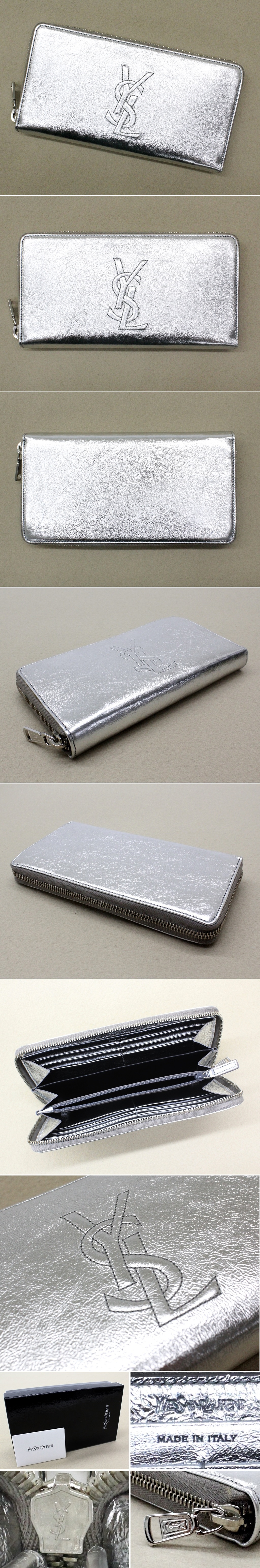 14万新品◆【サンローラン】シルバーレザーYSLステッチラウンドジップ長財布