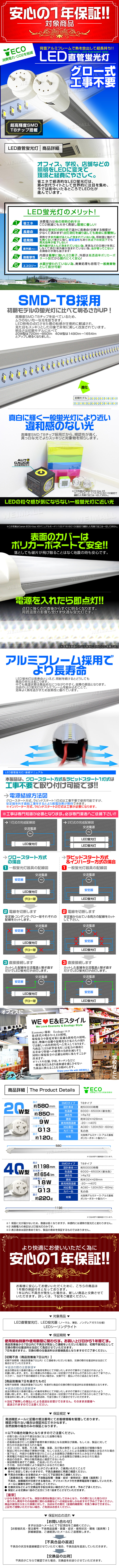 | 工事無しで簡単取り付け可能!! 今までネックになっていた配線工事を必要としないタイプです。 ◇ラビットスターター式やグロー球スターター式の器具はそのままご使用できます。 (一般蛍光管と交換するだけで使用できます。 ただし、ひとつの灯具に一般蛍光管や他のLED蛍光灯と混ぜて使用しないでください) ◇インバータ式、電子安定器、調光できる安定器を持つ灯具、 他社LED蛍光灯などのために配線加工や改造をされた灯具は使用できません。 また取り付けないで下さい。 無理に使用を続けると、動作異常となったり灯具や本製品が故障することがあり まれに発煙、発火に至るおそれがあります。 アルミレール採用による優れた放熱効果性の高い最新LED蛍光灯です。 高性能高輝度LED(SMD)を使用!驚異的な明るさを実現!! 高放熱アルミケース・アルミ基板採用!! 高透過率ポリカーボネート製カバー採用!! 放熱効果を高めつつ長寿命を確保!! 従来のLED蛍光灯よりも明るい!! 省エネ&長寿命&超軽量!! SMD 独特の、この輝度を、是非、体感して下さい。 LED(SMD)蛍光灯へ取り換えるだけでCO2をおよそ50~80%削減! 落ちても割れにくい飛散防止効果が高い安全設計! 長寿命で球切れいらずの省電力! 低発熱でチラツキ、ノイズが少なく虫が寄りにくい光ですので暑い時期に最適です。 (仕様) ①全長:1200mm ②蛍光部分長さ:1165mm ③太さ(プラスチック含む):31mm ④太さ(蛍光部分):28mm ⑤先部分楕円の大きさ(短い方):23mm ⑥先部分楕円の大きさ(長い方):28mm ⑦先部分楕円の横から見た長さ:8mm ⑧接続部分の金属の長さ:7mm ※写真と実物は多少異なる場合がございます。あらかじめご了承下さい。 |
