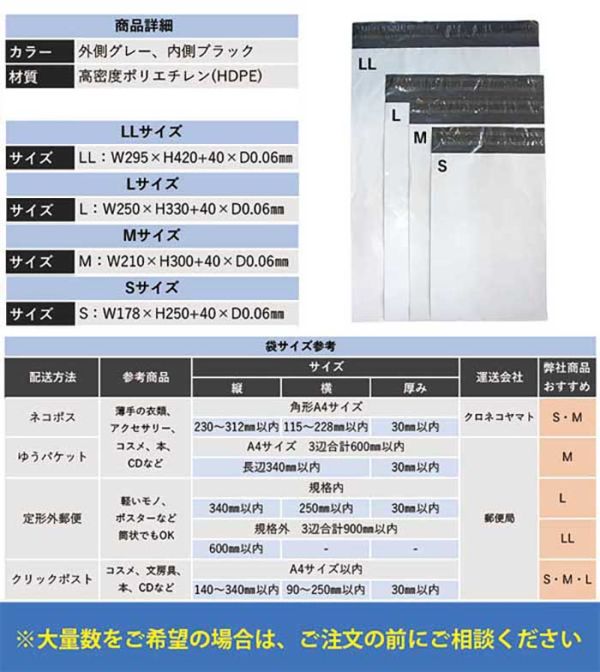 ◆伸縮性&破れにくい 引っ張り強さ、フィルムの腰の強さがあり、薄手でも強度が得られます。 ◆耐水性 機械的強度、電気特性、耐水性、耐薬品性に優れています。 ◆中身が透けない 外側がライトグレー、内側がブラック。透けないので、中身が見えません。 ◆テープ付 梱包も容易にでき作業効率も良い商品です。 ◆強力な粘着力 粘着強度のあるテープ付です。 ◆匂いが少ない