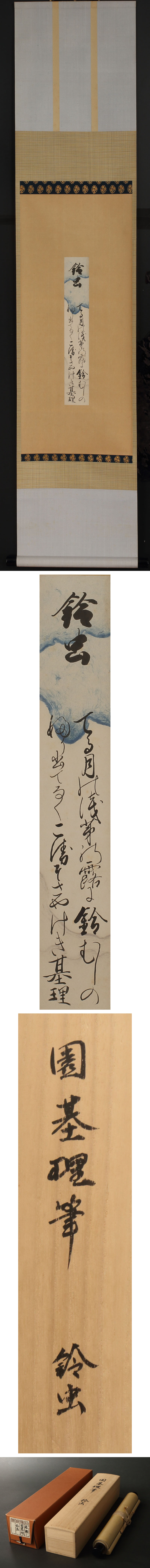 園基理の和歌短冊です。 「鈴虫」を題に、「てる月の浅茅の露に鈴むしの ふり出てなくこゑぞさやけき」と詠んでおります。 基理は青山御流挿花を家職とする園家に生まれ、母系では衣紋道を家職とした高倉家の血を引きます。享和元(1801)年、本居宣長の中山愛親への進講へ同席した公卿の中にも名を連ねており、国学への関心が窺われます。 鈴虫だけに、「振り出でて」鳴くというのもまた面白い、清新な書風の逸品です。 ◆園基理 江戸中・後期の公卿。園基衡の子。青山御流19世。正二位・権大納言。文化12(1815)年没、58歳。 付属:識箱が付属します。 寸法:高さ137cm、幅29cm(最大幅。若干の誤差はご了承下さい) 状態:経年のイタミがございます。 |
