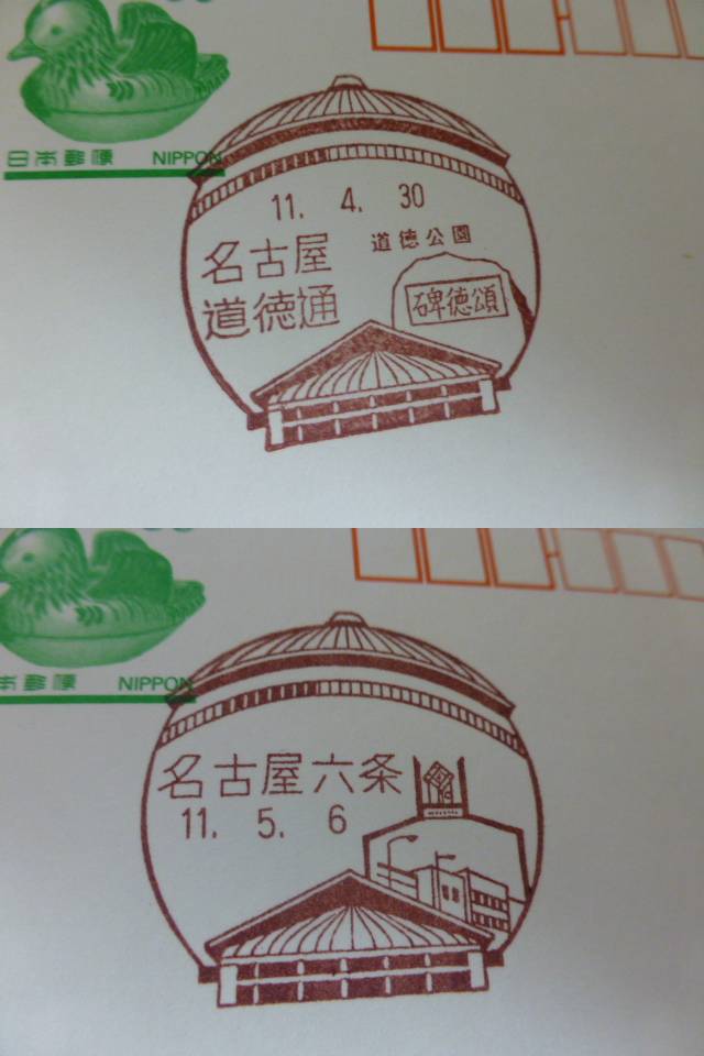 ☆鴛鴦はがき 初日風景印 2枚 名古屋道徳通 H11.4.30・名古屋六条 H11.5.6