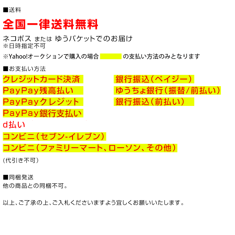 ▼ 商品に関するお問い合わせはこちら ■対応時間 10:00~15:00 土日祝日休業 ※商品に関するお問い合わせや初期不良等のご連絡はやり取りの履歴を残すために、 お手数ではございますが、必ず下記のメールアドレスにご連絡ください。 qgbvr82114@yahoo.co.jp ▼ 営業日・支払い方法・発送・返品・交換・保証に関して ※必ずお読みください 営業日・支払い方法・お届けについて・返品・交換・保証に関する件は、以下のページにて詳しく記載しております。 営業日掲載ページはこちら 営業日カレンダー掲載ページ 支払い方法・お届けについて・返品・交換・保証に関する掲載ページはこちら お買い物ガイド詳細ページ プライバシーポリシーに関する掲載ページはこちら プライバシーポリシー記載ページ ▼ 質問が多かった即決落札について 即決で落札する方法 即決で落札するには ├PC版の場合は、商品画像右の「今すぐ落札する」をクリックします。 └スマホ版の場合は、(1)「入札する」をタップします→(2)最高入札額記入欄に、即決の金額(税抜)をご記入頂ければ即決できます。 入札→即決落札した場合の履歴に関して ご入札頂いているYahoo_IDで即決価格で再度ご落札して頂ければ、前の入札の履歴は残りますが前の分はキャンセルとなり、即決価格のみでのご落札となります。重複しませんのでご安心ください。 ▼ オークションに関して 入札後の各種確認メールについて 当店からの受注確認メール・入金確認メール・発送確認メールが「迷惑メールフォルダ」に自動で振り分ける場合がございます。 「フォルダを空にする」前にメールが届いているか一度ご確認ください。 ご落札の際は、以下3つの当店メールアドレスが届くように受信設定をお願いいたします。 wm-world@weiec.jp w_m_world@yahoo.co.jp qgbvr82114@yahoo.co.jp 当店からの各種確認メールは、オーダーフォームに登録のメールアドレス宛に送信されます。 取引方法 手渡しでの直接取引には対応できません。物流業務を委託していますので、 お近くにお住まいの方でも商品のお受け取りに来ていただくことはできません。 在庫について 当社では、卸販売など各方面でも商品を同時販売しております。 在庫情報は随時更新(新規出品の停止、個数少数での出品、出品取り消しなど)させて頂いておりますが、ご落札頂いた際に時間差などで売り切れになる場合もございます。 予めご了承ください。 キャンセルについて 入札後のキャンセルは一切お受けできません。 やむを得ぬ事情により落札後キャンセルをされる場合には、落札者都合によるキャンセルとなり、 オークションのシステム上自動的に落札者にマイナス評価がつきます。 ご了承ください。 落札後3日以内にご連絡が取り合えないお客様についてはやむを得ずキャンセル処理をさせていただく場合もあります。 商品の価格について 当サイトでは、正確な価格表示に努めておりますが、 万が一表示価格やご注文商品の金額に誤りがあった場合、誤表記を理由にご注文を取り消させていただくことがございます。 取り消しに際し、お客様にはメールにて販売価格をお知らせしご注文を継続されるか否かのご確認をさせていただきます。 なお、これによりお客様にご不便やご迷惑をおかけした場合でも、 直接的または間接的な損害についての補償は致しかねますことを、何卒ご理解のほどお願い申し上げます。 交換返品返金について お客様都合での、交換・返品・返金は一切対応できません。 評価について 著しく評価の悪い方の入札はご遠慮願います。 領収書発行について 商品代引きご利用の場合は、伝票が領収書となりますので、別途領収書の発行はできません。 領収書発行希望のお客様は入札後、オーダーフォーム要望欄に必ず「領収書発行希望」をご記入の上ご連絡ください。 |