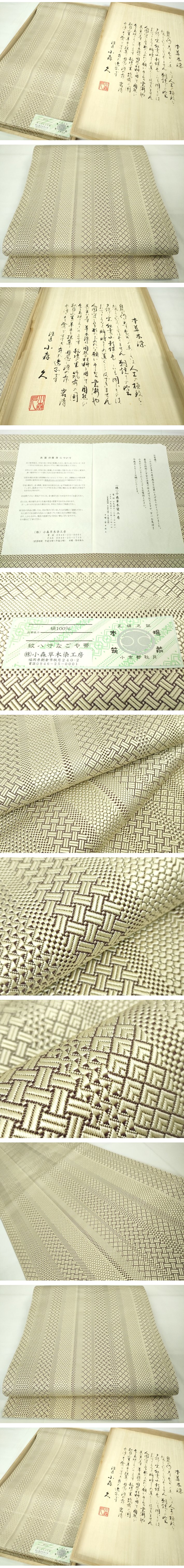 | 【正絹】 状態は締めてはおりますが 特に目立ったシミ汚れなどもなく大変良い状態です。 小森久は1928年、筑前秋月で生まれた草木染めの染匠です。 草木染め一本で60年以上のキャリアを持ち、 自ら「本・草木染」と名付けた高い技術と独創性が評価され、 昭和50年には甘木市無形文化財に指定されました。 小森草木染手織工房の染匠・小森久によって作られた染物は、 「同じ色は二度と出せない」ことから希少価値の高い存在になっています。 無形文化財に指定されております。 本場筑前博多織は、 福岡県福岡市博多区やその周辺で生産される絹織物です。 仏具のひとつである独鈷、華皿を基にした幾何学模様が織られています。 江戸時代に筑前藩主だった黒田長政が幕府への献上品にしたことから、 博多献上、献上博多とも呼ばれます。 横畝が際立って見える経畝織りという織りになっています。 30〜60本の細い経糸を使うため、こしやはりがあり、 地合が硬く、光沢感があります。 きちんと締まり、くずれにくい、締めやすい帯といわれています。 大変上質な極上の逸品になります。 お安く出品致しますので、是非この機会にいかがでしょうか?