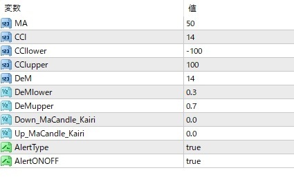 down↓サイン時up↑サイン時MAとローソク足の実体との距離(0.1pips単位)をそれぞれ変更できます。