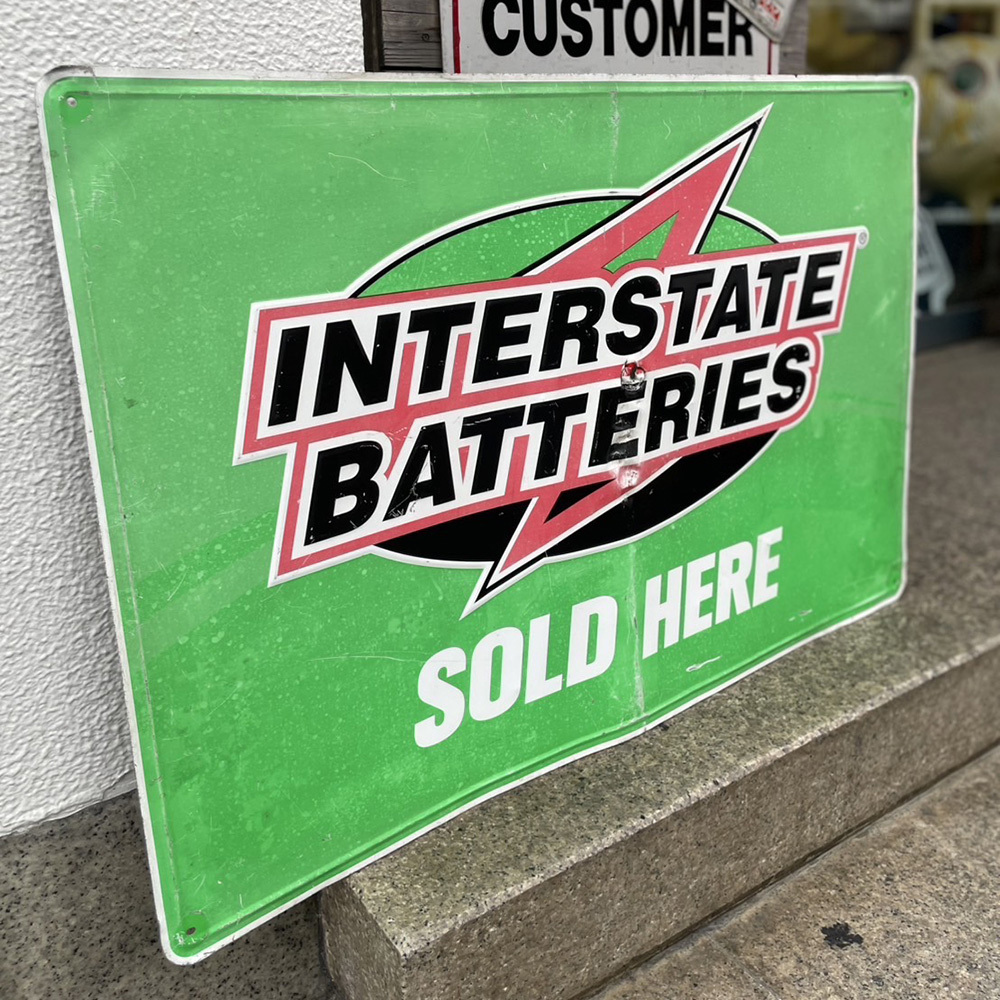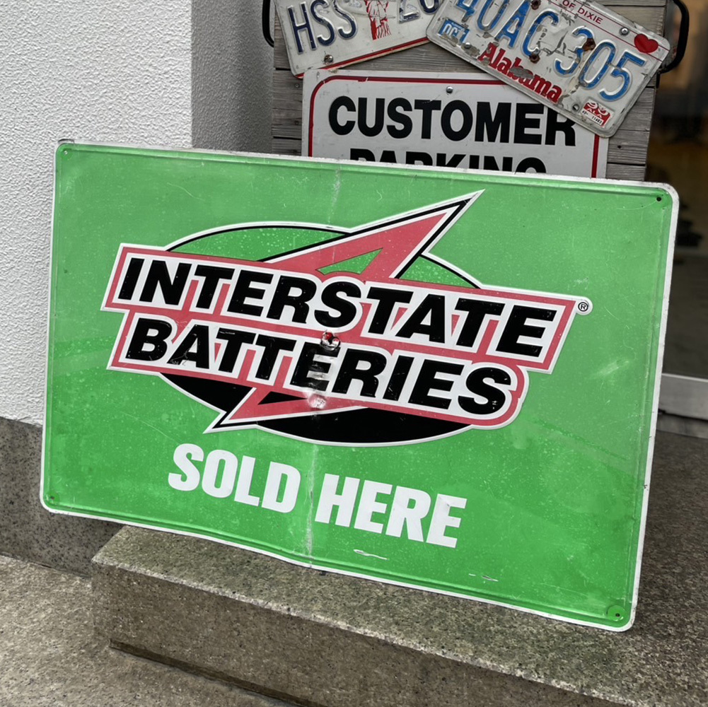 アメリカを代表するバッテリーブランド「Interstate Batteries」のヴィンテージ看板が入荷!グリーン×ブラックの配色に赤い稲妻が映える、インパクト抜群のデザインは、ガレージやピットスペースのアクセントにぴったり!サイズ:横91.3cm、縦61cm【 お知らせとお断り 】製品の性質上や製造上の細かな傷や多少の変形・色むらなどある場合がございます。また、掲載画像は現物と若干お色が異なって見える場合がございます。予めご了承くださいませ。【 ヴィンテージ品 (USED) 】※USED年代物の為、現状渡しとなります。※経年劣化による汚れ・傷・歪み・変色・剥げ等がございますので予めご了承の上ご購入下さいませ。※風合いを残すためクリーニングは最小限に留めております。ご自身でクリーニング・メンテナンスをお願いいたします。※ヴィンテージの風合いをご理解いただける方のみお買い求めください。北海道、沖縄、離島地域への宅配便配送は別途送料をお見積させていただきます。※実店舗や他の販売サイトと在庫を共有しているため、売り違いが発生する可能性がございます。その際には、何卒ご理解いただけますようお願い申し上げます。お客様にはご迷惑をおかけしないよう、努めてまいります。