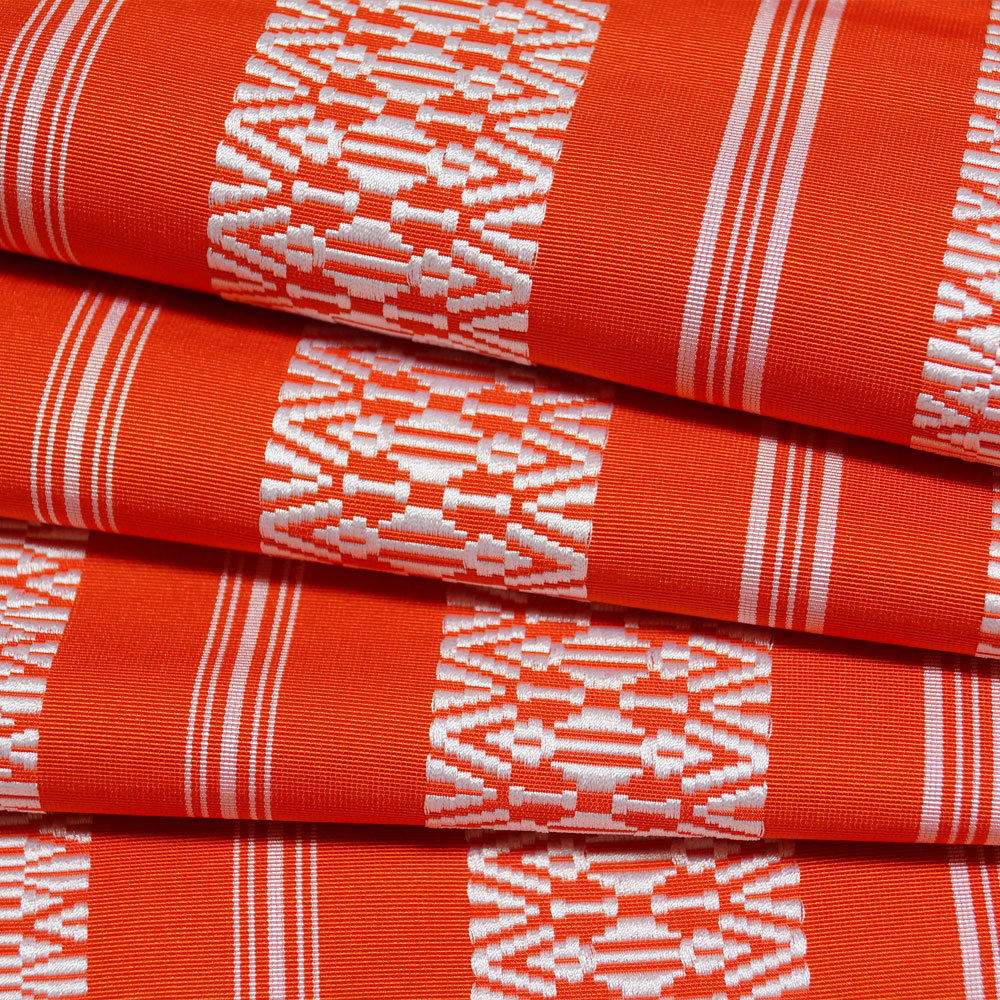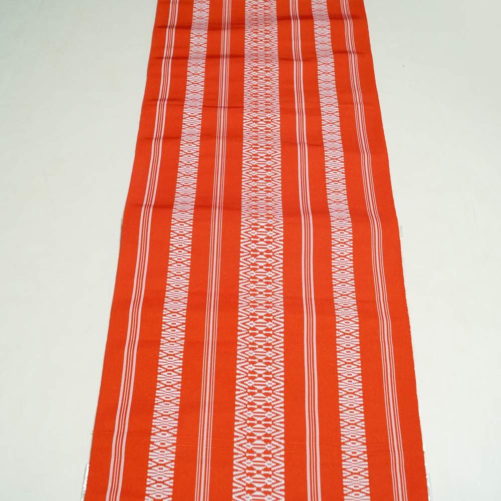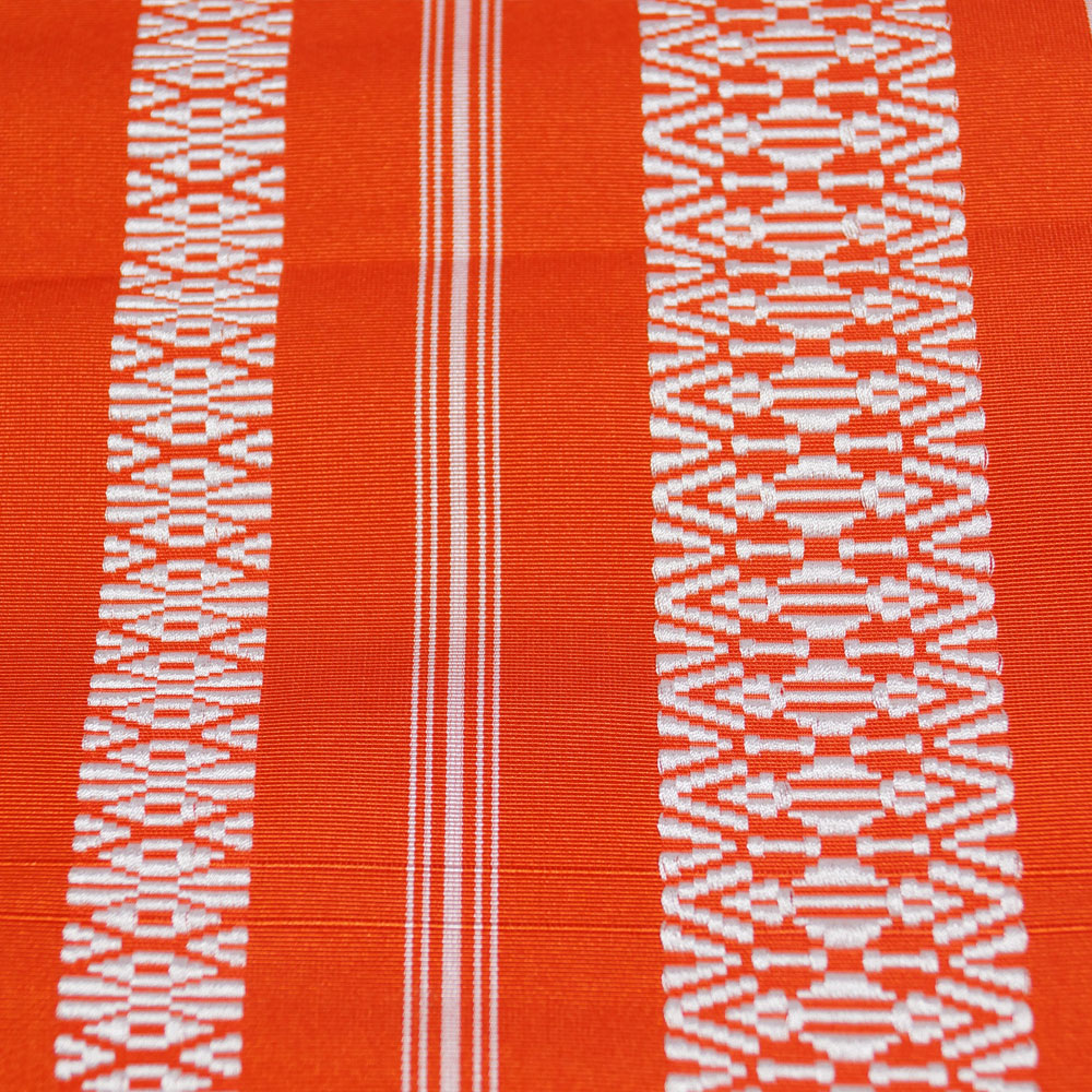 | 商品 説明 | 緋色系の地に白の献上縞模様が織られた八寸名古屋帯地です。 |