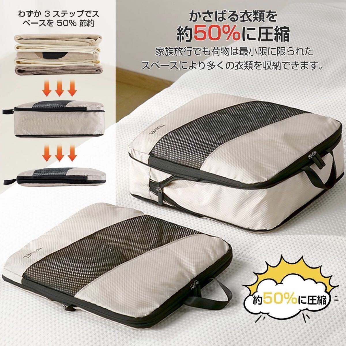 服を圧縮バッグに入れ圧縮ジッパーを閉めることでスーツケーススペースを50%節約することができます。それだけではなく、収納する物を分別することができ、物の取出しも便利になる。