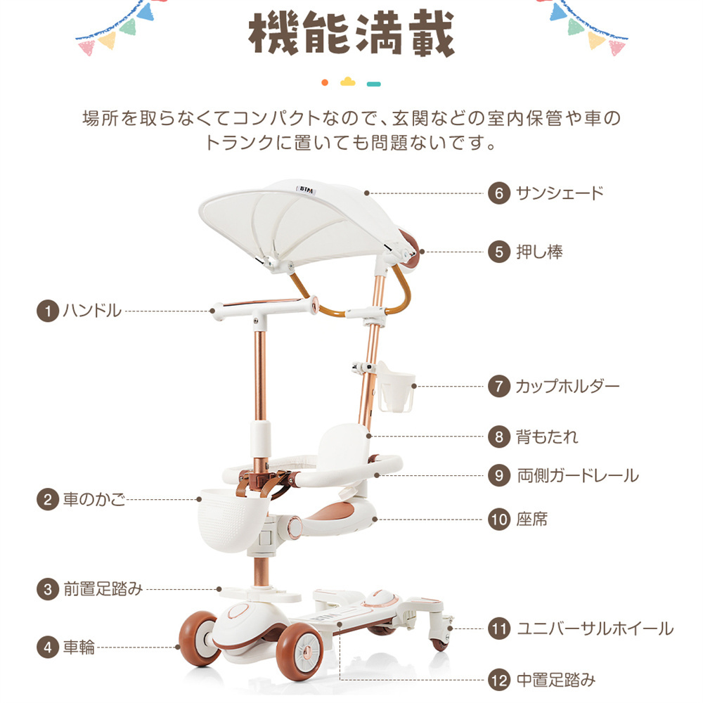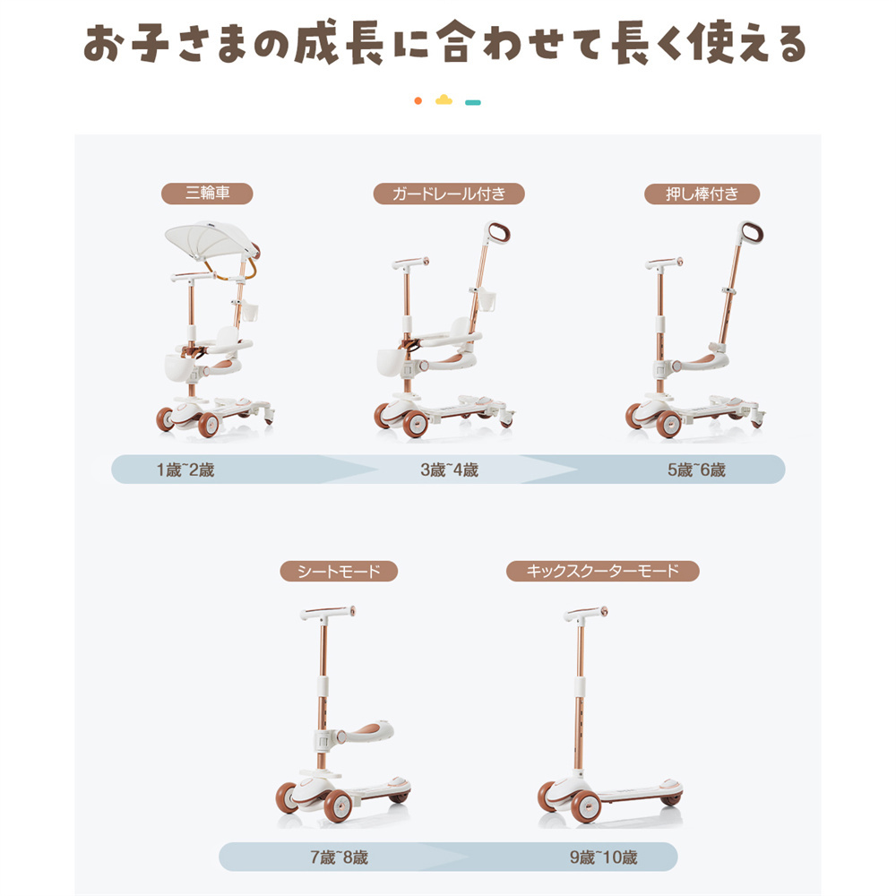 • ●お子さまの成長に合わせて長く使える 三輪車(1歳~2歳)ガードレール付き(3歳~4歳)押し棒付き(5歳~6歳)シートモード(7歳~8歳)キックスクーターモード(9歳~10歳)