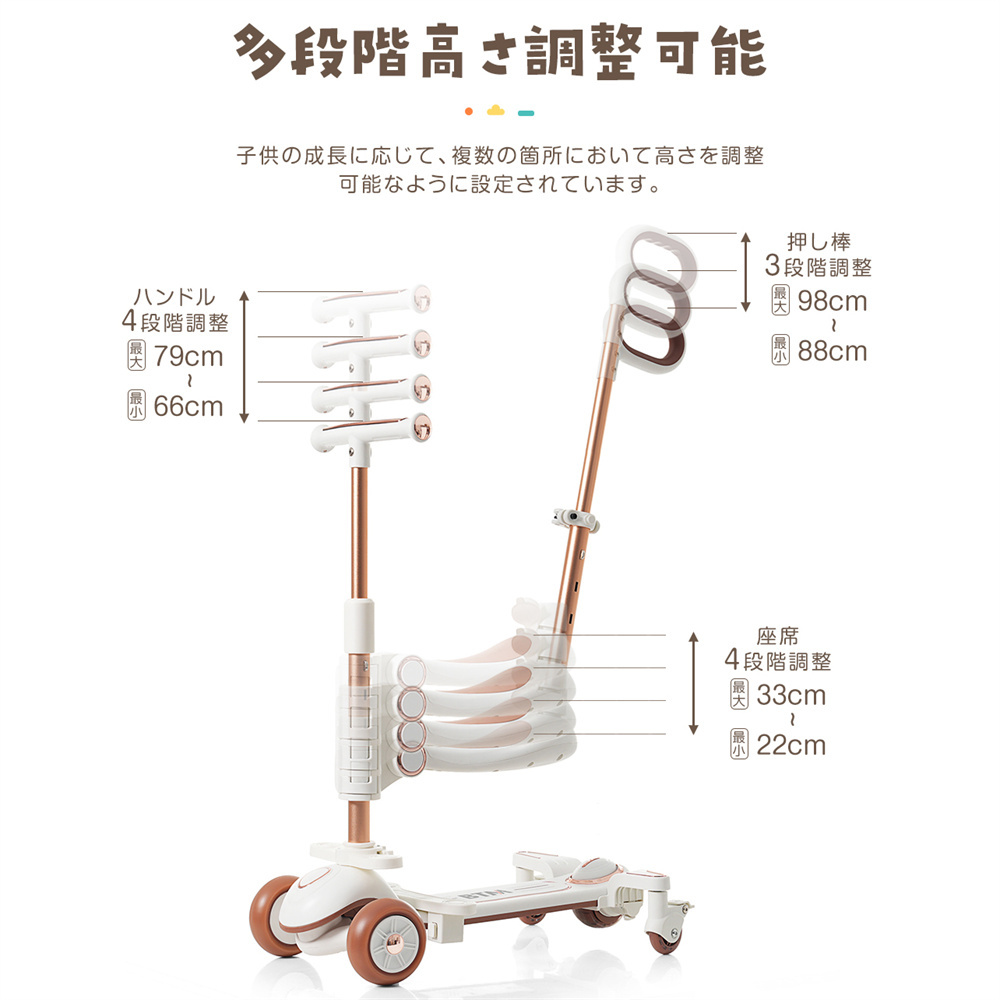 • ●多段階高さ調整可能 ハンドル(4段階調整)座席(4段階調整)押し棒(3段階調整)6.左右に方向転換が可能 重心を移動するイメージでハンドルを曲がりたい方向に傾けると左右どちらでも進みたい方向に曲がることができます。 遊びながら、バランス感覚や運動神経の向上を促進します。