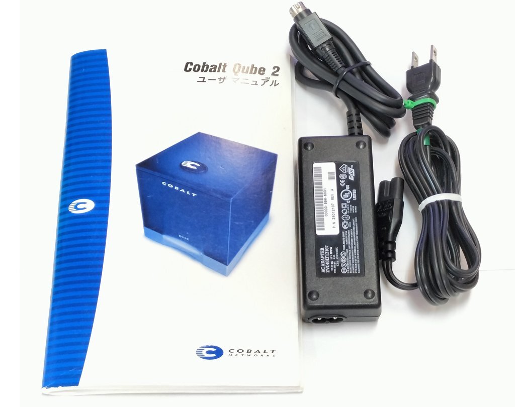 Sunの小型サーバ、Sun Cobalt Qube2に付属していたユーザーマニュアルとACアダプターです。