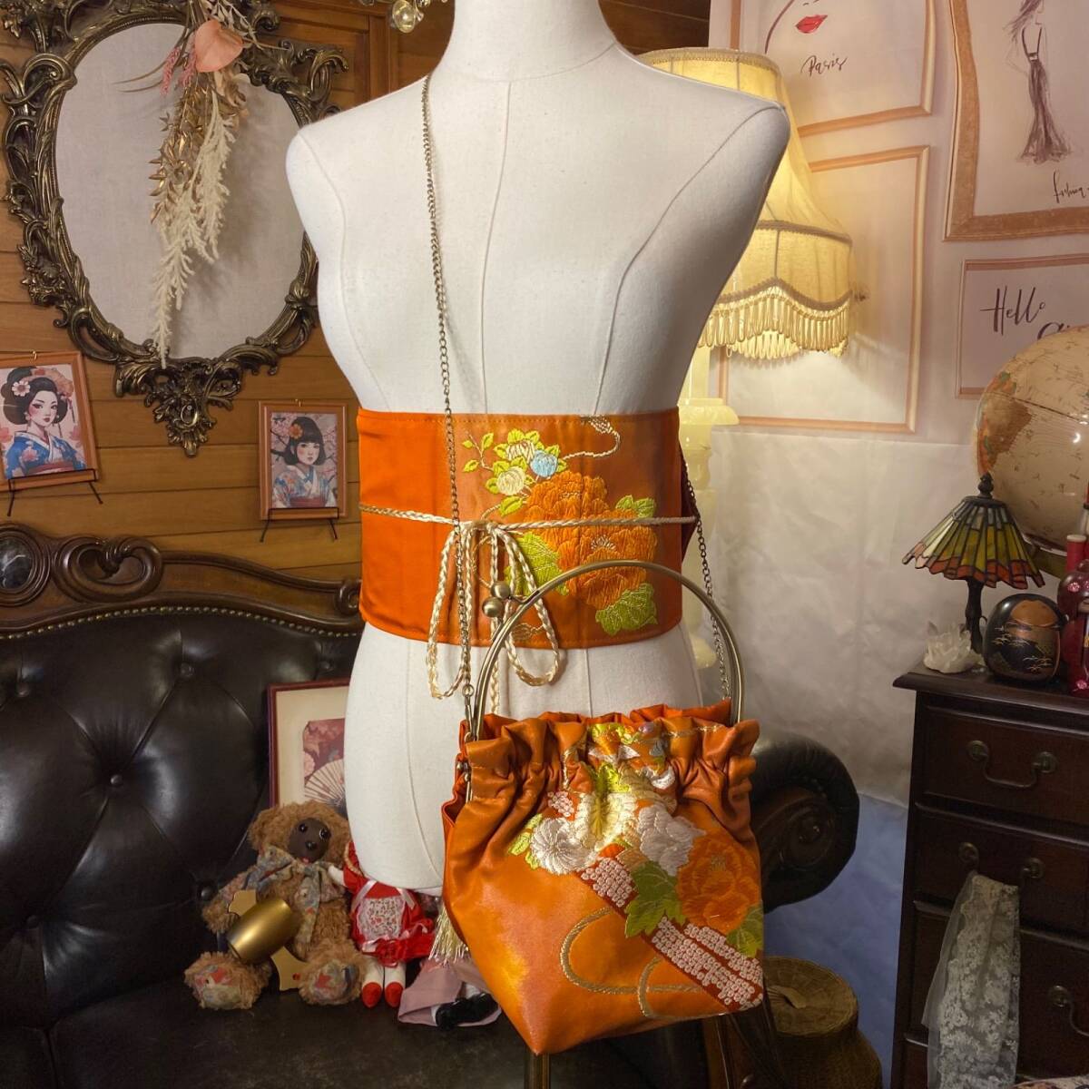 深い柿色に金糸が艶めく名古屋帯をほどき、一枚の布の美しさをそのまま生かして仕立て直したのが、このサッシュベルトとハンドバッグのリンクセットです。帯に織り出された牡丹と菊の意匠が、ベルトではウエストをぐるりと取り巻き、帯紐タッセルで結ぶたびに軽やかに揺れてコルセットのようにシルエットを引き締め、バッグではふっくらとしたギャザーの巾着に姿を変えて立体的な花姿を咲かせます。真鍮色の丸ハンドルと華奢なチェーンを合わせたバッグは手持ち・ショルダー・クロスと自在に使え、纏うだけで和の格調とモードなエッジを同時にまとえる、唯一無二のリメイクセットです。