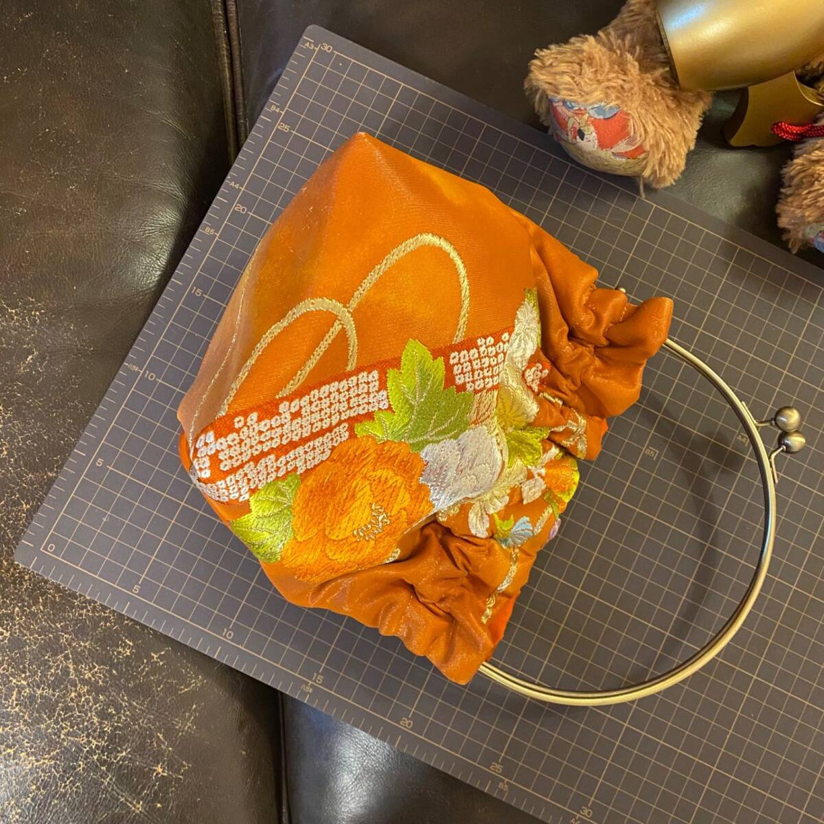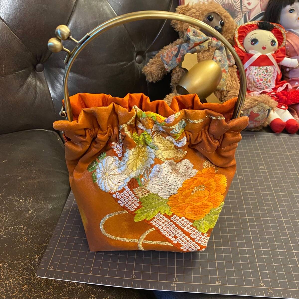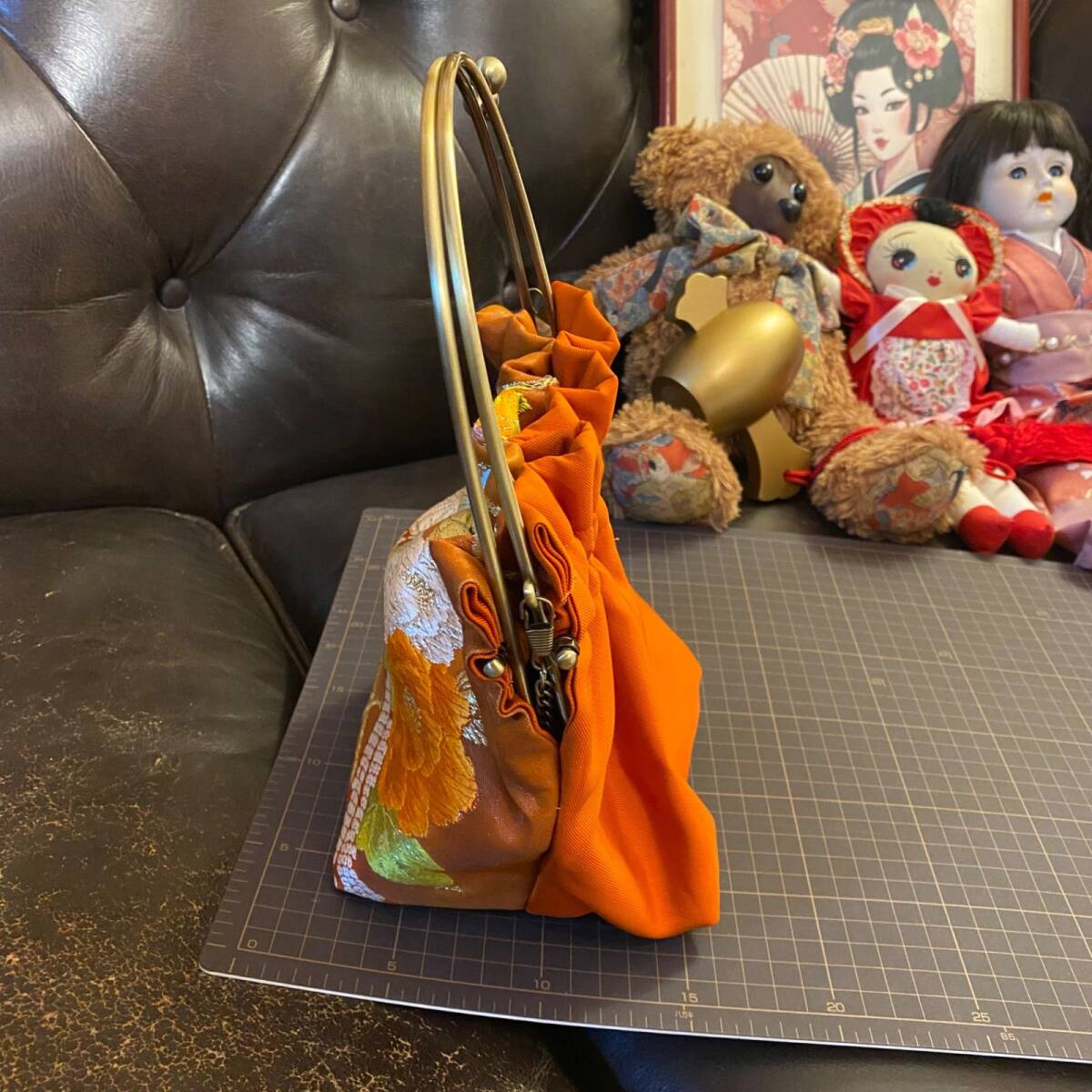 【和洋折衷 名古屋帯リメイク ハンドバッグ バック ショルダーチェーン付き ガマ口タイプ 帯サッシュベルト セット 深い柿色に金糸が艶めく あ-114】