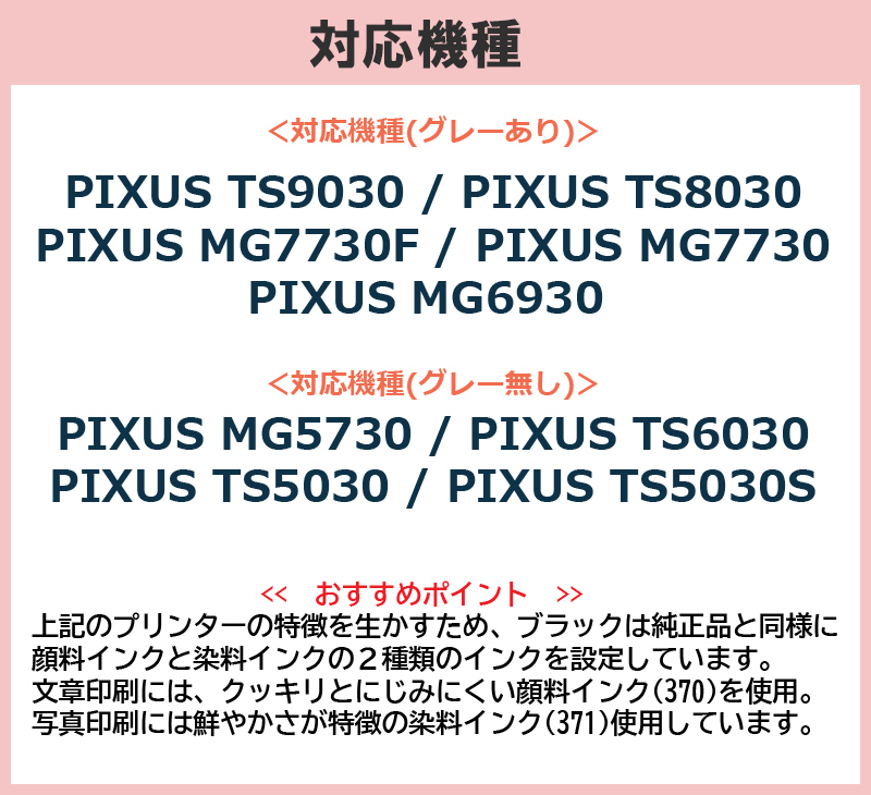 純正品番 BCI-371XL+370XL/5MP BCI-371XL+370XL/6MPに対応した大容量版の互換インクです。純正インクではございません。