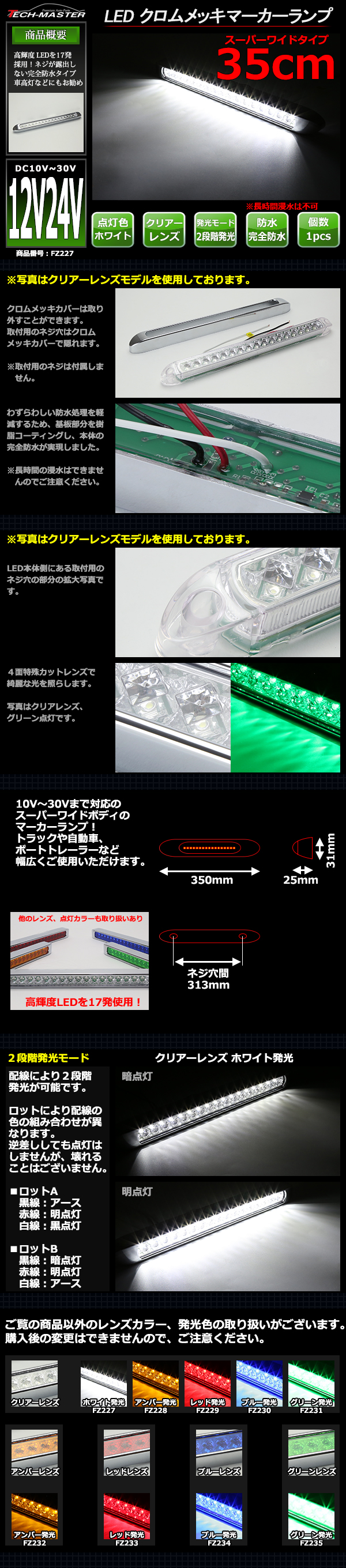 ■商品コード FZ227 ■商品タイトル 12V/24V兼用 汎用 LED17発使用 スーパーワイド35cm クロムメッキ マーカー ランプ 防水タイプ ■対応電圧 DC10V?30V ■発光色 ホワイト ■レンズ色 クリアー ■サイズ 商品画像に記載 ■点灯モード 2段階発光(配線は画像に記載) ■数量 1個 出品数以上も在庫がある場合は対応可能です。 事前に必要数があるかご質問いただければ回答します。 ■特徴 10V?30Vまで対応のスーパーワイドボディのマーカーランプ! トラックや自動車や、ボートトレーラーなど幅広くご使用いただけます。 横幅35cmもある超ドデカボディのマーカーランプです。 マーカーを車高灯にご使用で、小さいと思われてた方にこのドデカボディはオススメの商品です。 基板を樹脂コーディングし、完全防水となっております。 ※短時間の水没は大丈夫ですが、水中では使用できません。 ■注意事項 ※発光色、レンズカラーの変更はできません。 ロットにより配線の組み合わせが異なります。 配線は逆差ししても点灯はしませんが、壊れることはございません。 取り付けネジは付属しません。 |