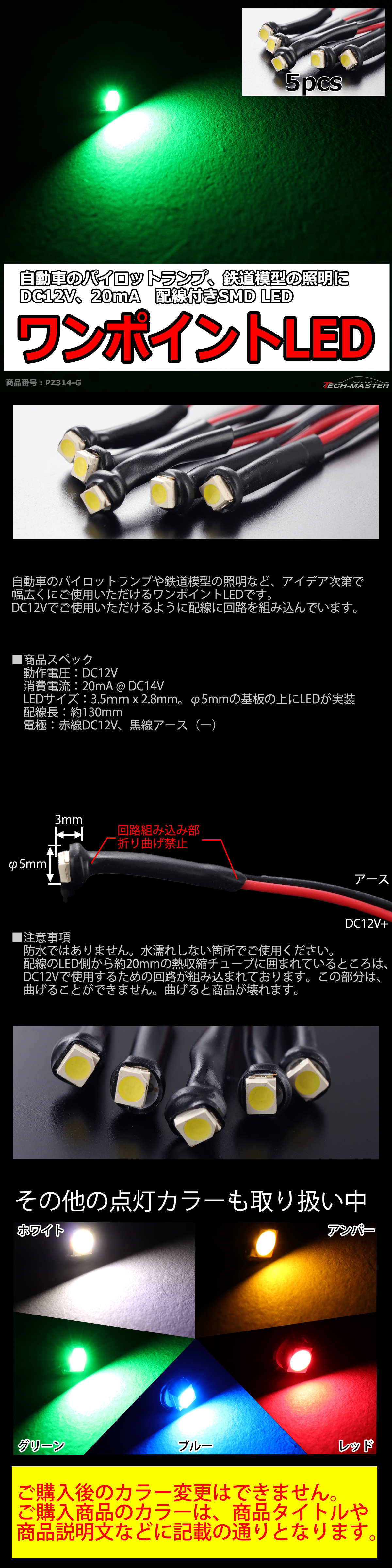 | ワンポイントLED 5本セット 数量:1セット5本 対応電圧:DC12V 消費電流:20mA @ DC14V 点灯色:グリーン LEDサイズ:3.5mm×2.8mm。φ5mmの基板の上にLEDが実装。 配線長:約130mm 電極:赤線DC12V、黒線アース(ー) |
