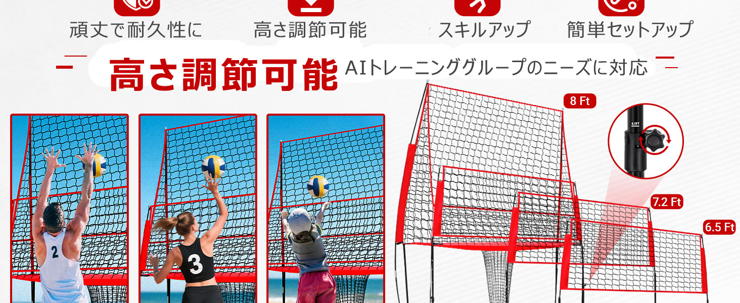 【製品の概要】2in1 バレーボール練習ネットで、屋内・屋外(ビーチバレー含む)兼用! 競技・学校・家庭での練習に最適。高さ調節可能(200~240cm)で、初心者から上級者まで幅広く使える練習アイテムです。数分で簡単組み立て、いつでもどこでもバレー練習が可能に